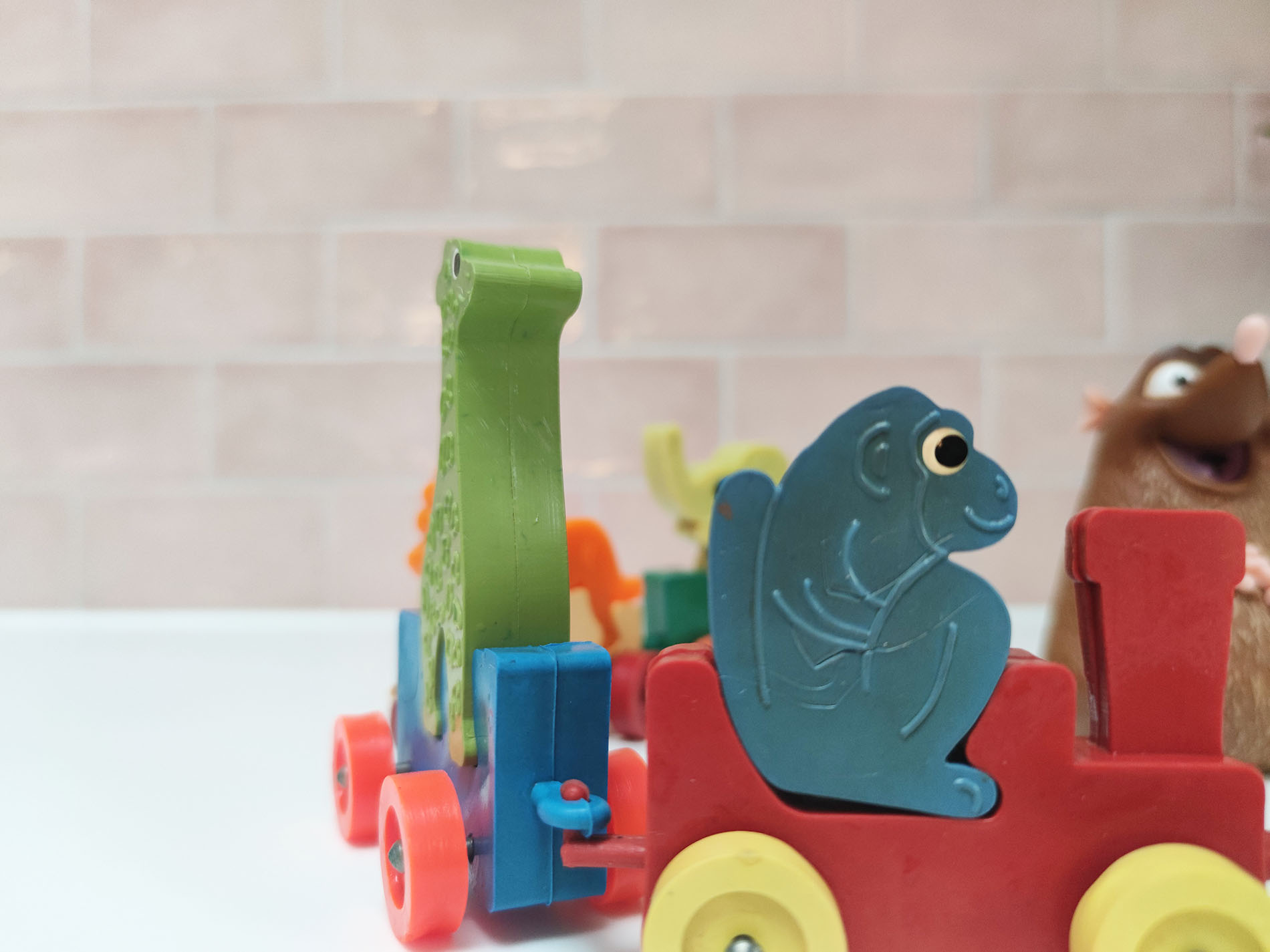 Vintage jaren 70 rubberen puzzel trein. De beestjes zijn los te halen van hun treintje.