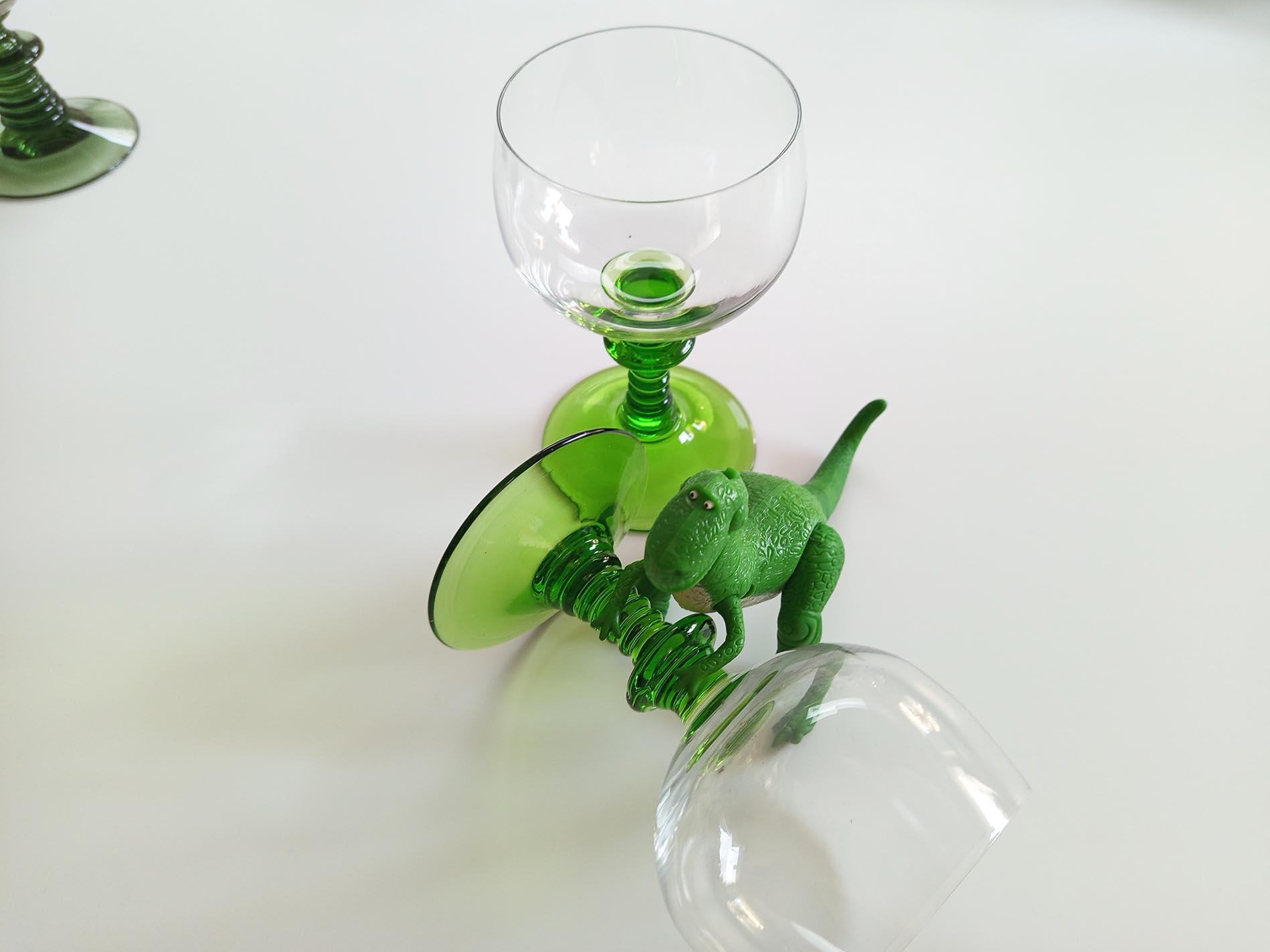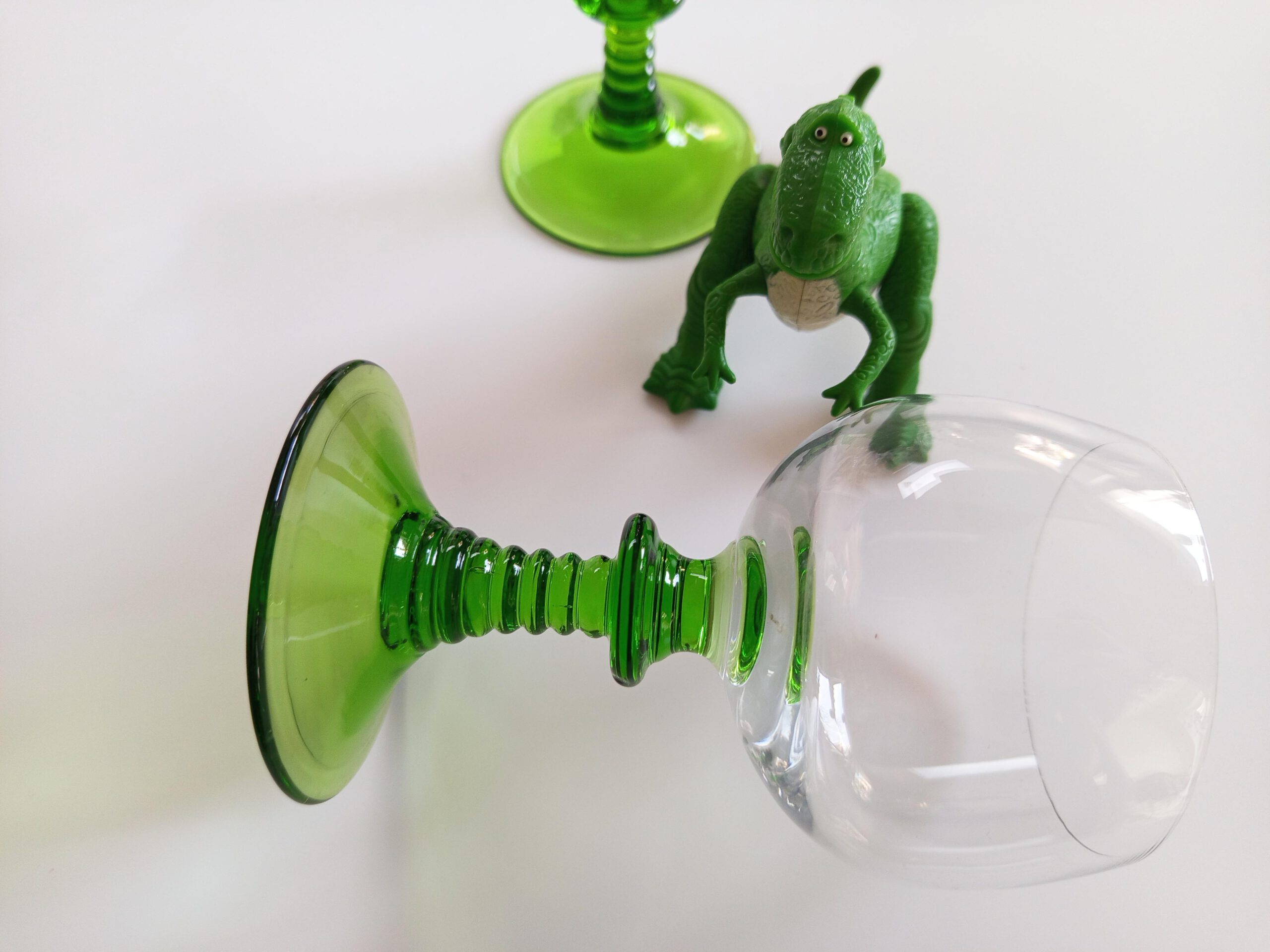Mooi vintage wijnglas. Jaren 30 art deco . Met een heldere groene voet. Een echte eye-catcher voor op tafel. Inhoud 0,2 liter. Deze variant is helder van kleur we hebben ook een aantal op voorraad met een iets donkere kleur voet. Prijs is per stuk we hebben meerdere op voorraad.