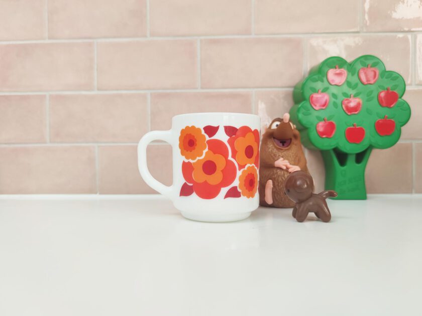Arcopal grote mok / beker met retro lotus bloemen opdruk. Lak ziet er nog netjes uit.