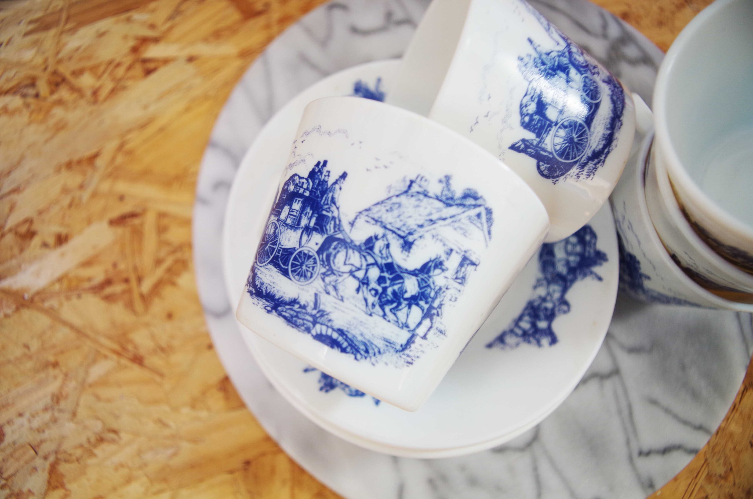Vintage arcopal set kop en schotel set van 5 met blauwe opdruk. Uniek setje blauwe print tafereel van paard en wagen.