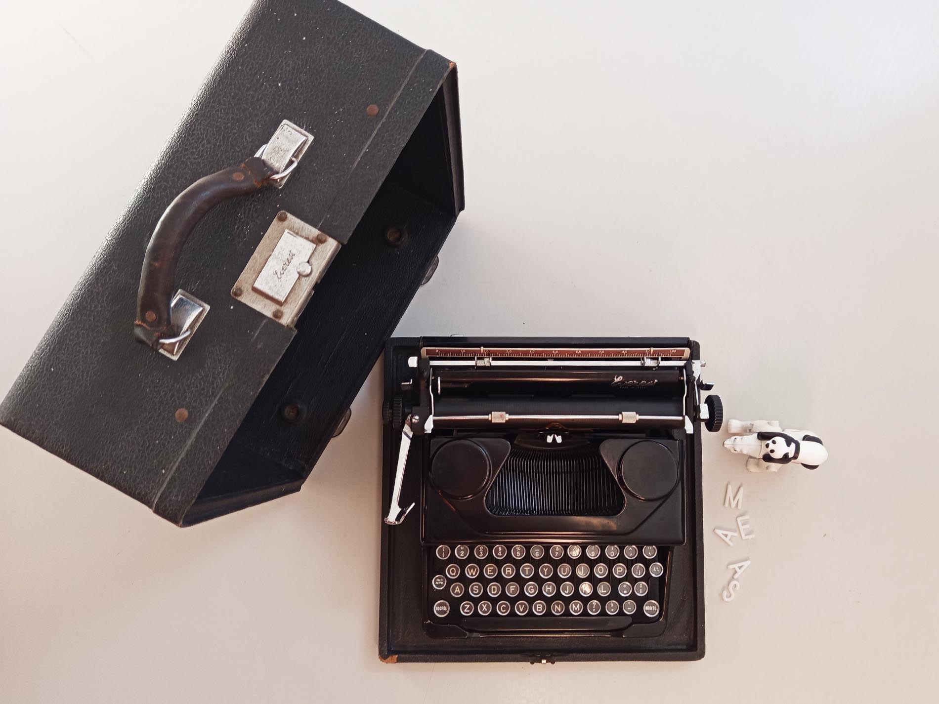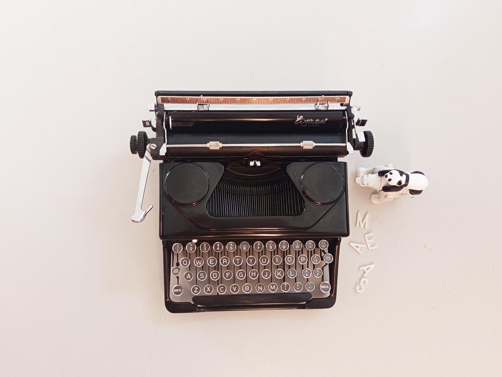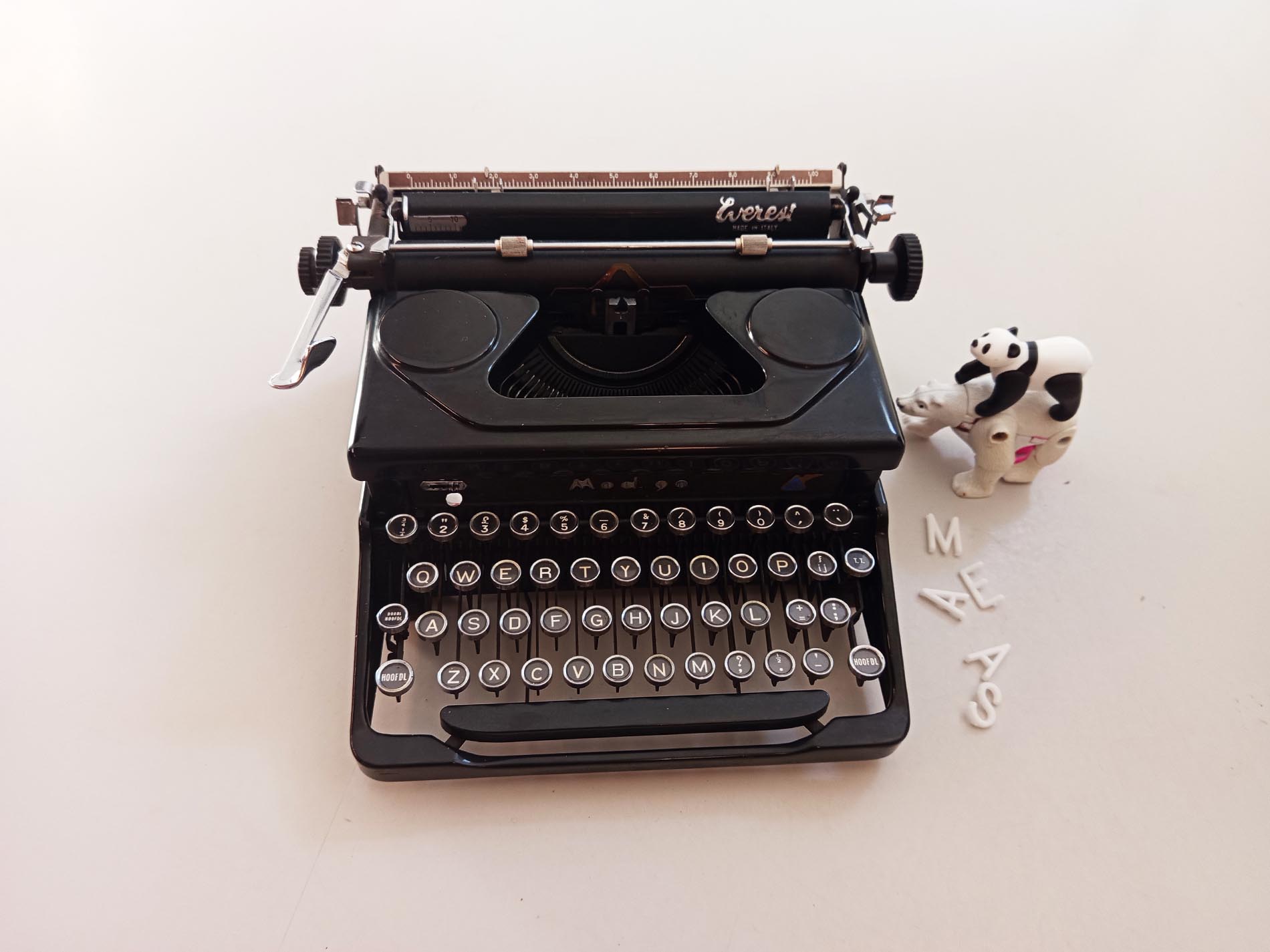 Oude stoere robuuste italiaanse Everest Mod.90 typemachine. Het is een ouder model met prachtige details zoals het sierlijke logo wat een prachtig lettertype heeft. Ook ziet de typemachine er nog zeer netjes uit. De typemachine is getest en is voorzien van nieuw lint maakt gebruik van een afwijkend spoeltje. Ook zal deze typemachine zeker niet misstaan in je interieur een mooi stukje eyecandy. Deze Everest is uitgerust met het geliefde Elite-lettertype, dat bekendstaat om zijn fijne, elegante en gelijkmatige letters – perfect voor creatief schrijfwerk, journaling of decoratief gebruik. Een karaktervol stuk met authentieke uitstraling, ideaal voor liefhebbers van vintage, schrijfmachines en unieke interieuritems