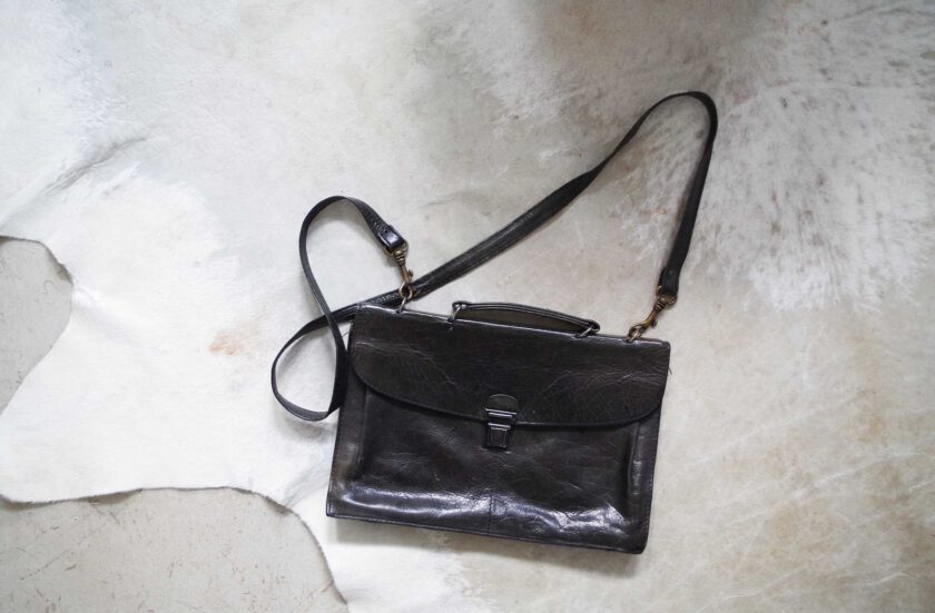 Vintage mooie lederen schoudertas in een unieke kleur het is een grijsgroene kleur tegen het zwart aan. Ook is de tas te dragen als handtas het hengsel is verwijderbaar.