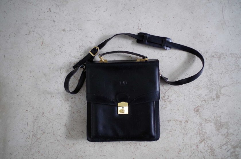 Vintage lederen zwarte stevige schoudertas. Een tas voorzien van meerdere opbergvakken en is een redelijk groot model.