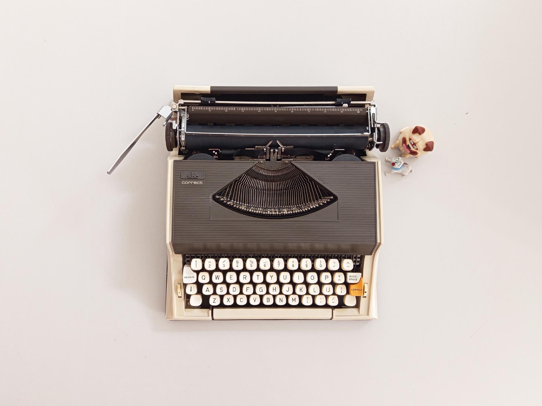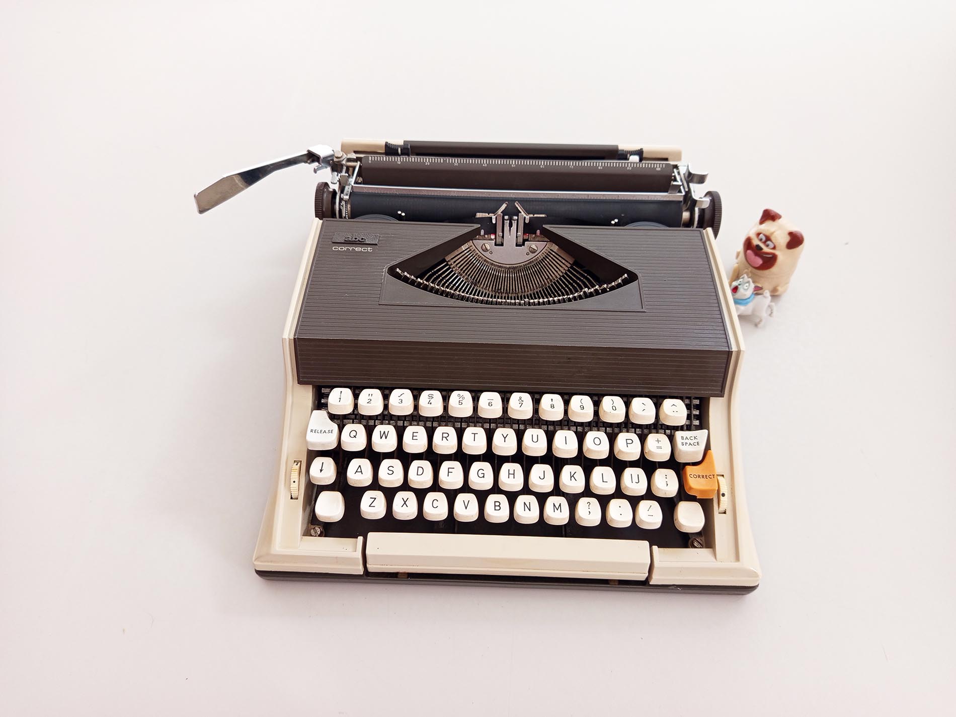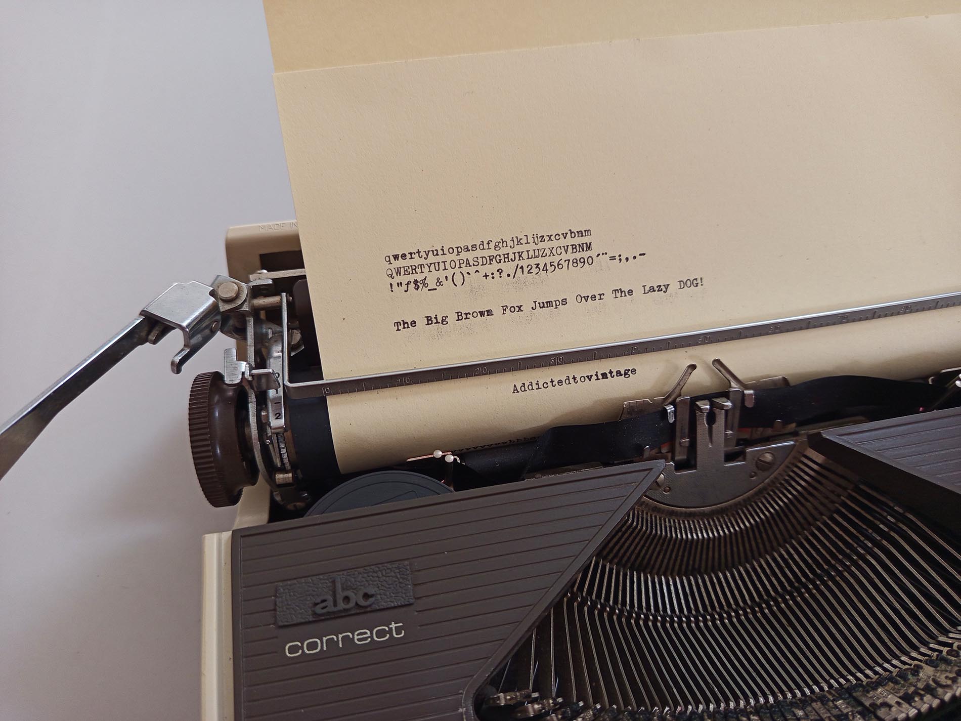 Vintage ABC Correct typemachine. Een niet veelvoorkomend merk en model waarvan zelfs de slagletters zeer verfijnd typen heeft het lettertype Pica .De typemachine is gebruiksklaar werkt naar behoren. De typemachine heeft een nieuw lint. Maakt gebruik van een universeel lint. Het unieke aan deze typemachine is de correctie knop waardoor je makkelijk een fout kan herstellen met bv typex maar ook heeft deze een Nederlandse ij. Helaas heeft deze niet meer een desksel die de typemachine goed afsluit en makkelijk verplaatst.