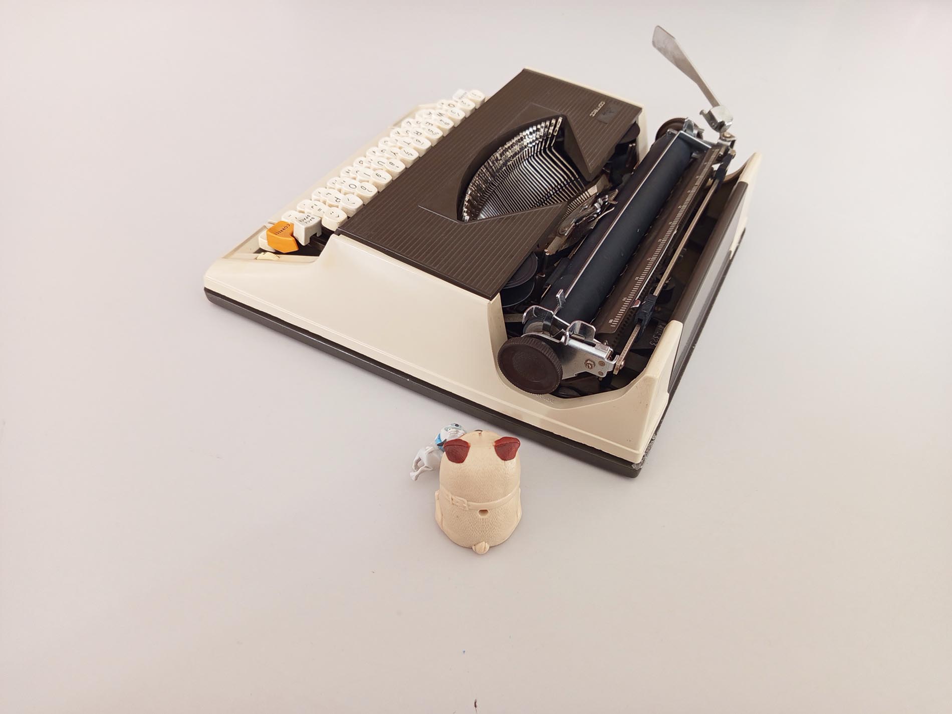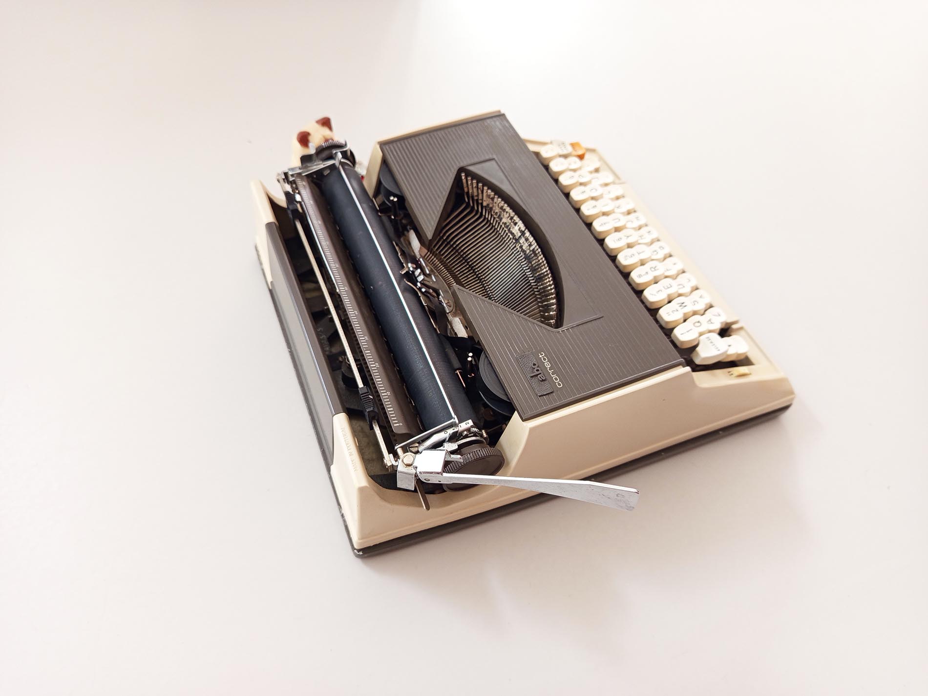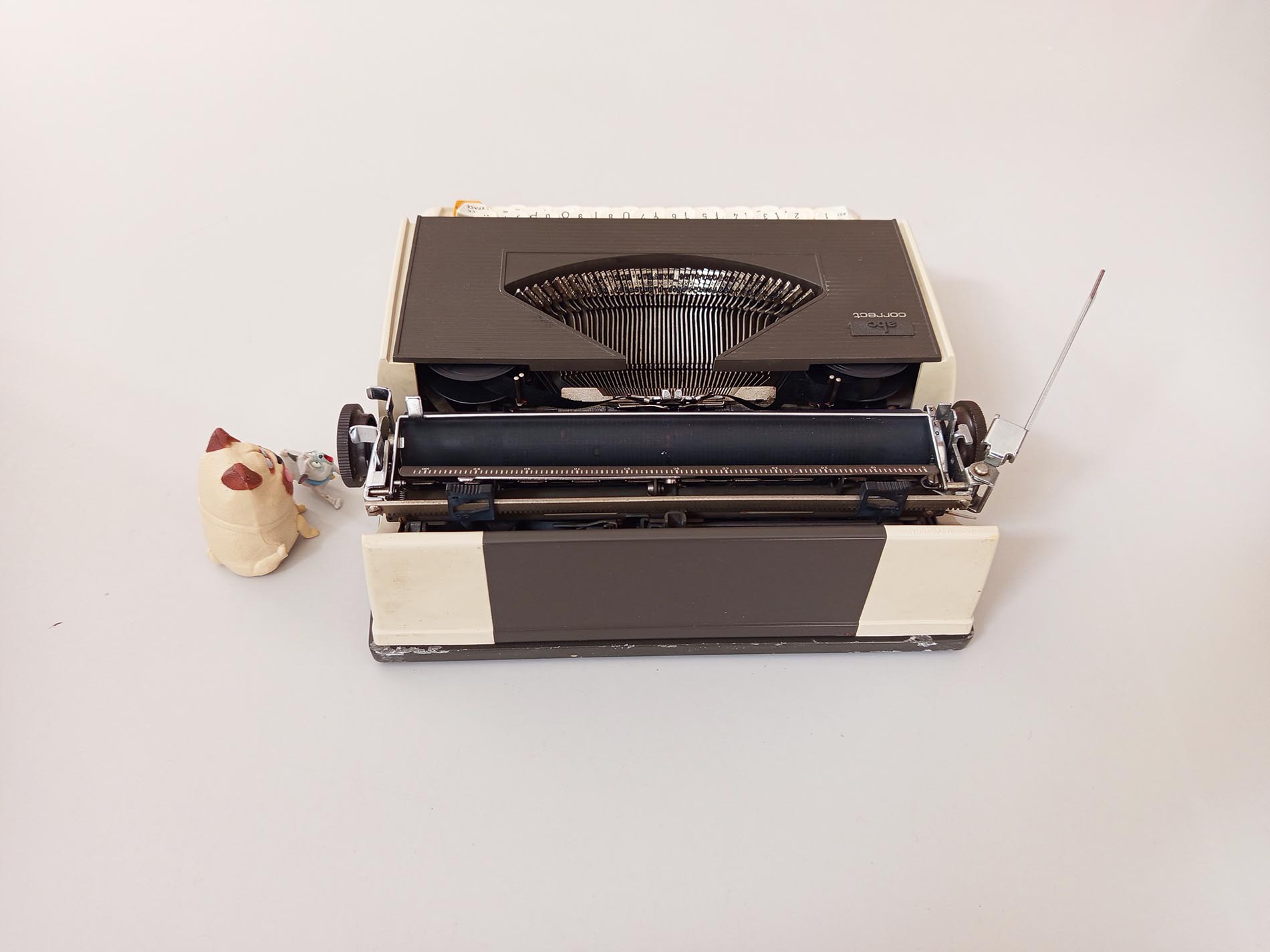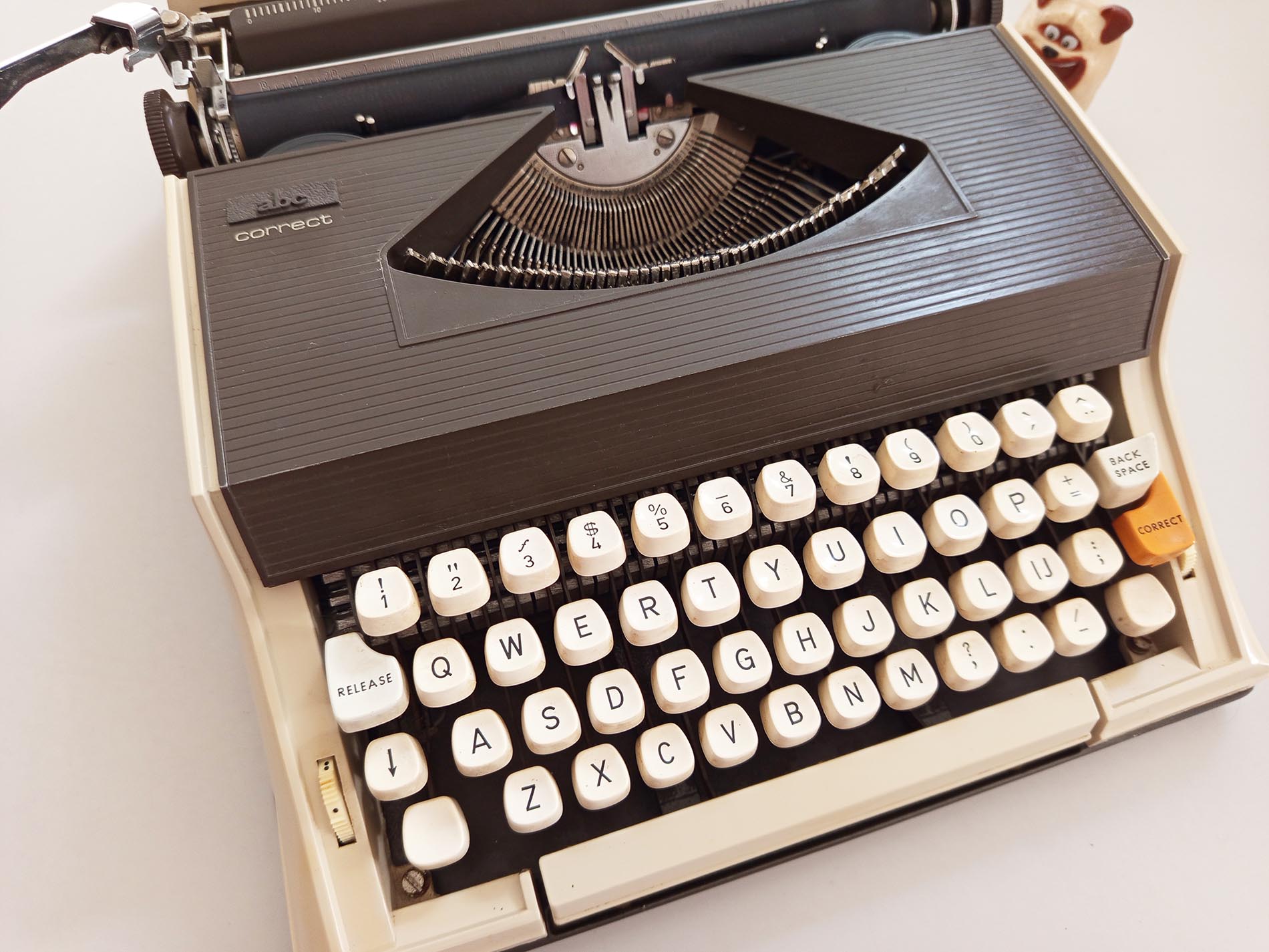 Vintage ABC Correct typemachine. Een niet veelvoorkomend merk en model waarvan zelfs de slagletters zeer verfijnd typen heeft het lettertype Pica .De typemachine is gebruiksklaar werkt naar behoren. De typemachine heeft een nieuw lint. Maakt gebruik van een universeel lint. Het unieke aan deze typemachine is de correctie knop waardoor je makkelijk een fout kan herstellen met bv typex maar ook heeft deze een Nederlandse ij. Helaas heeft deze niet meer een desksel die de typemachine goed afsluit en makkelijk verplaatst.