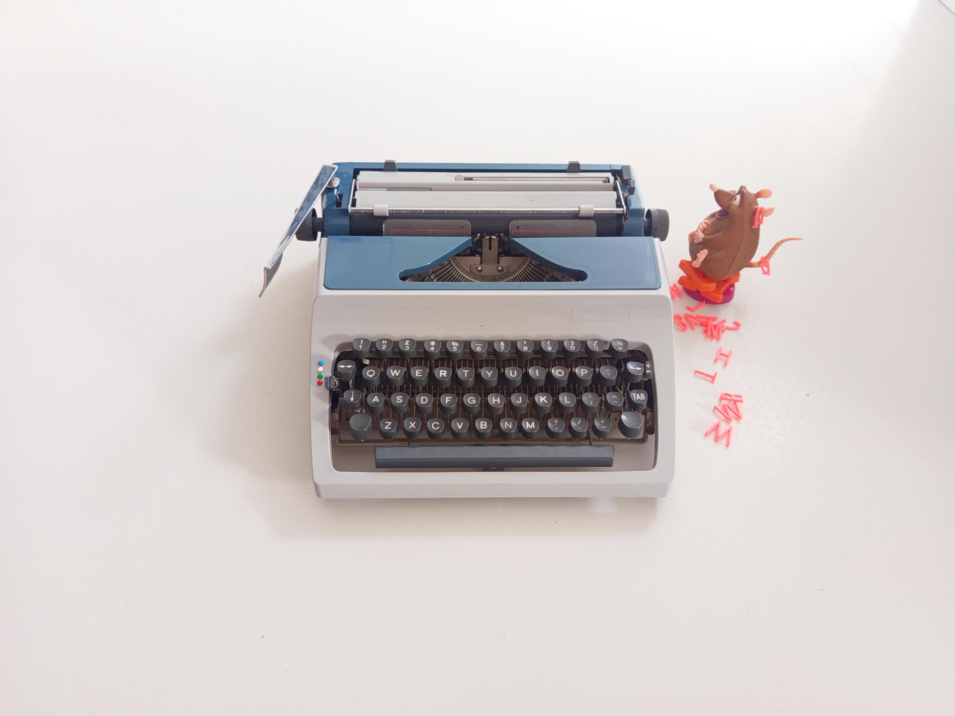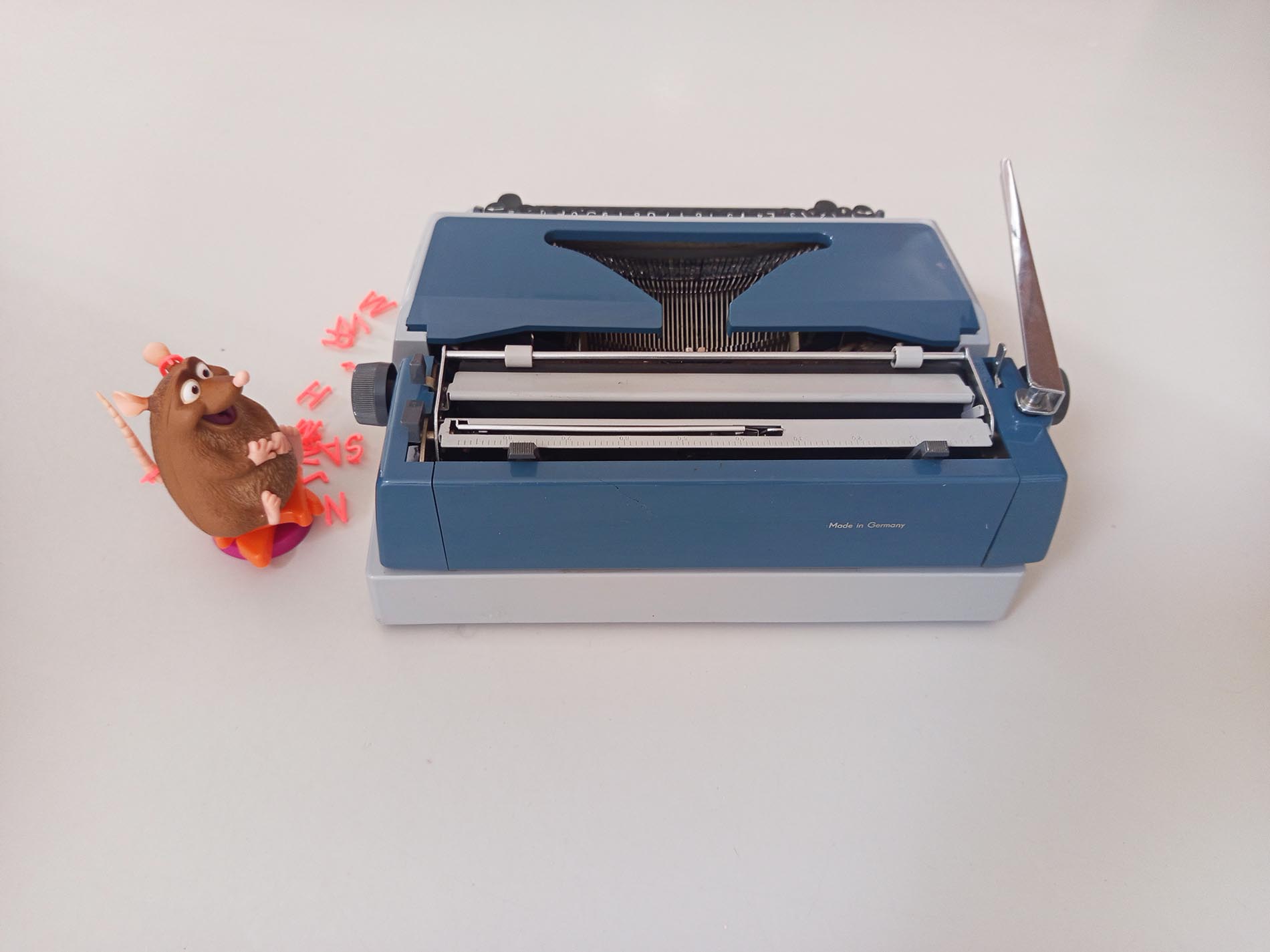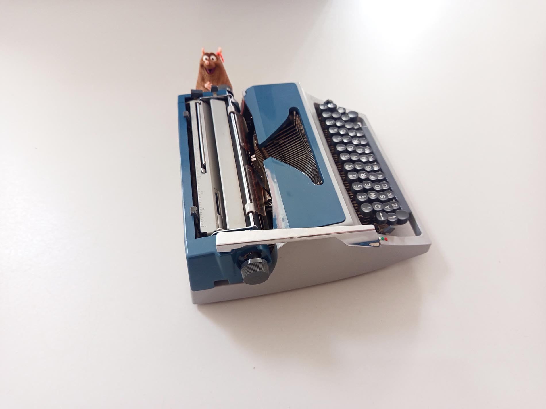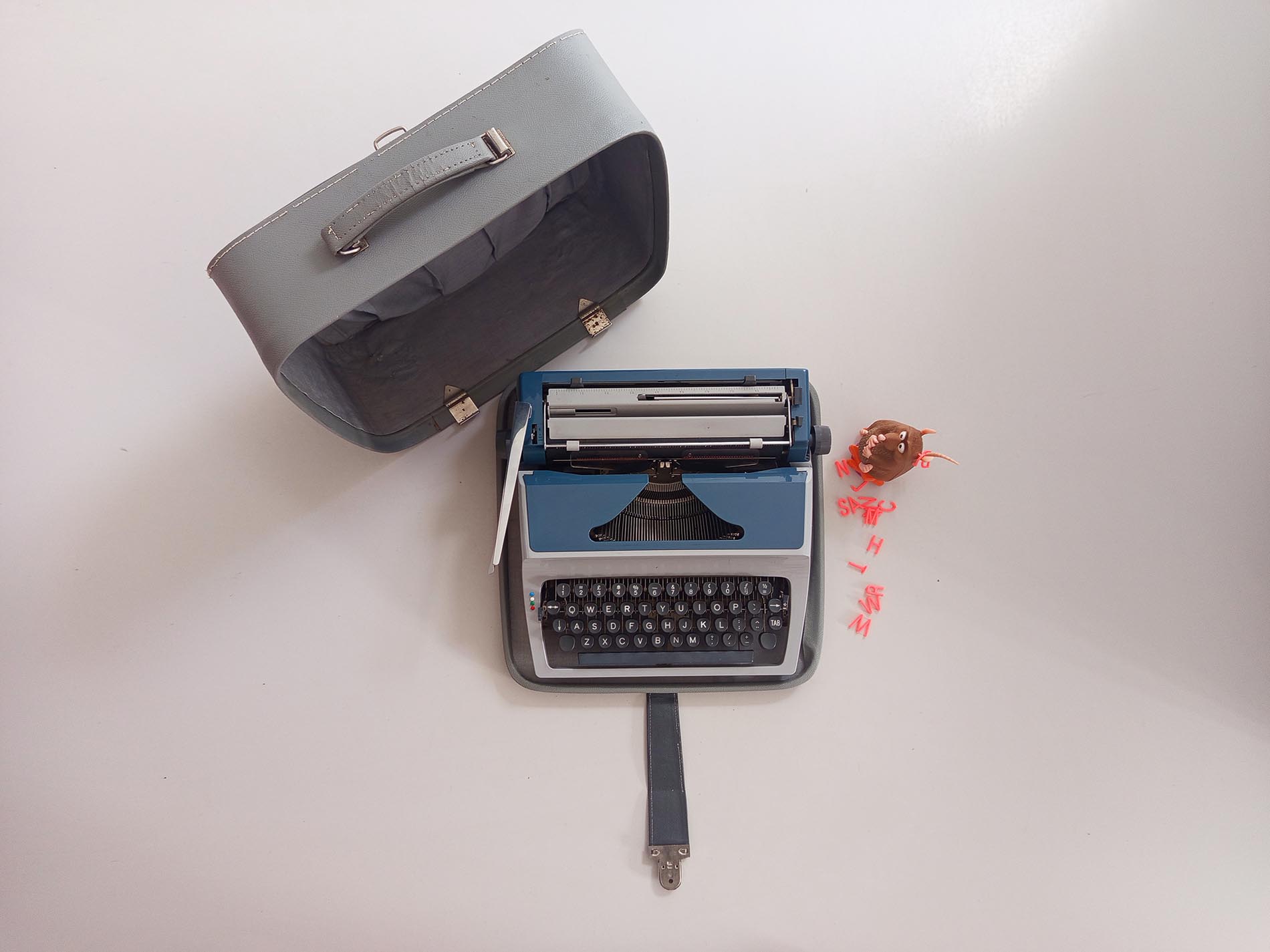 Vintage Erika typemachine – tweekleurig: grijs met blauw. Model 40 eind jaren 60 deze heeft een tab functie. Deze typemachine heeft een kunststof behuizing en ziet er verder nog goed uit. Heeft wel een breukje op de achterkant maar is niet storend. Ook ontbreekt het logo plaatje. Hij werkt prima en is getest. Er zit een nieuw lint in, en is direct gebruiksklaar. De typemachine wordt geleverd in een bijpassende koffer van imitatieleer. Een voordeel is dat deze typemachine gebruikmaakt van universeel lint, wat het vervangen ervan eenvoudig maakt.