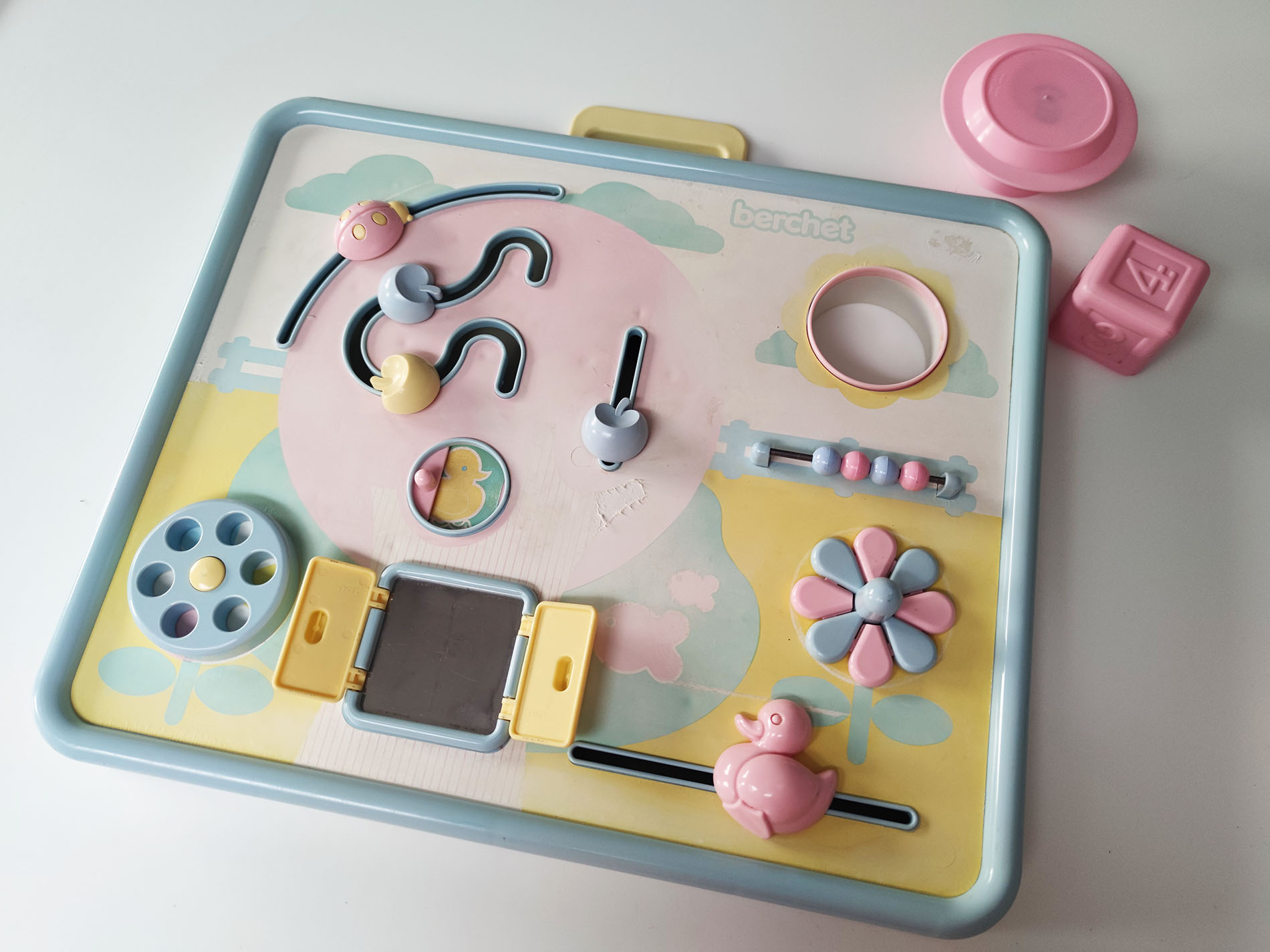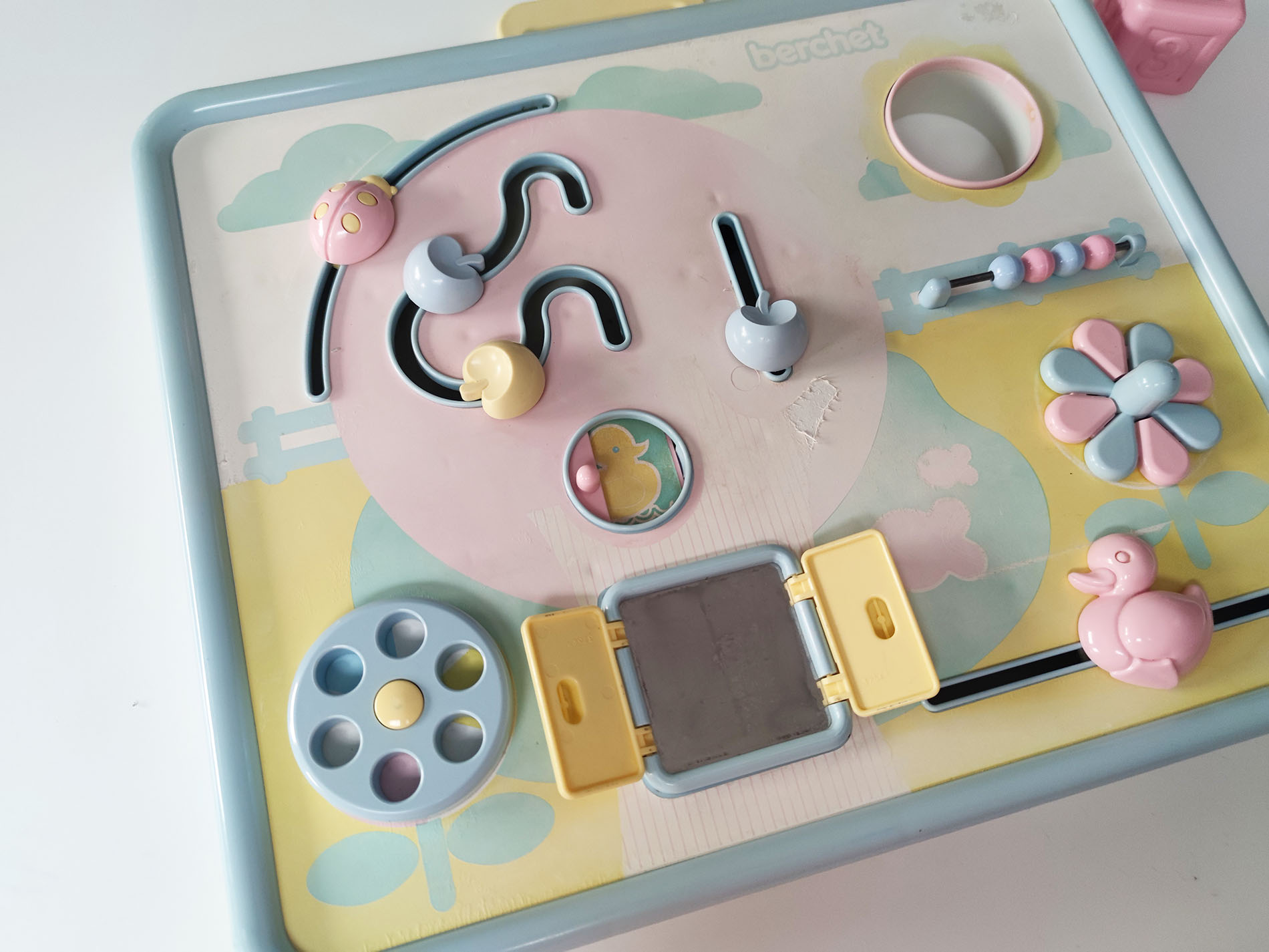Vintage activity center voor de allerkleinsten. Het is een mooi pastel variant van het merk berchet uit 1986. Deze is helaas niet meer aan de box te bevestigen het opzetstuk ontbreekt. Maar kan wel makkelijk overal mee naar toe. Ook heeft deze beschadegingen in de sticker en is wat verkleurd. Maar al met al blijft het een onzettend leuk item.