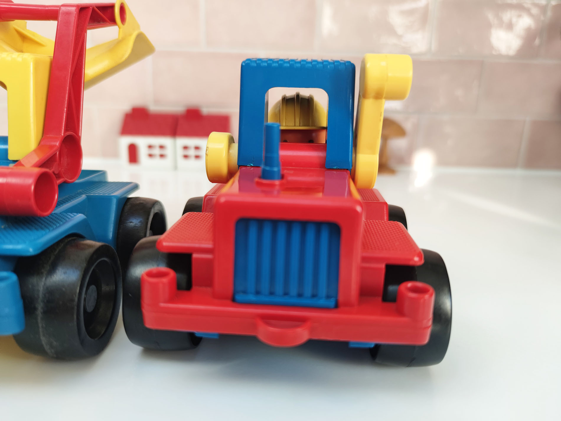 Vintage Jean Hoefler plastic set. Deze bestaat uit een poppetje en twee werkvoertuigen. Het is een ontzettend leuke set met veel humor in het poppetje.
