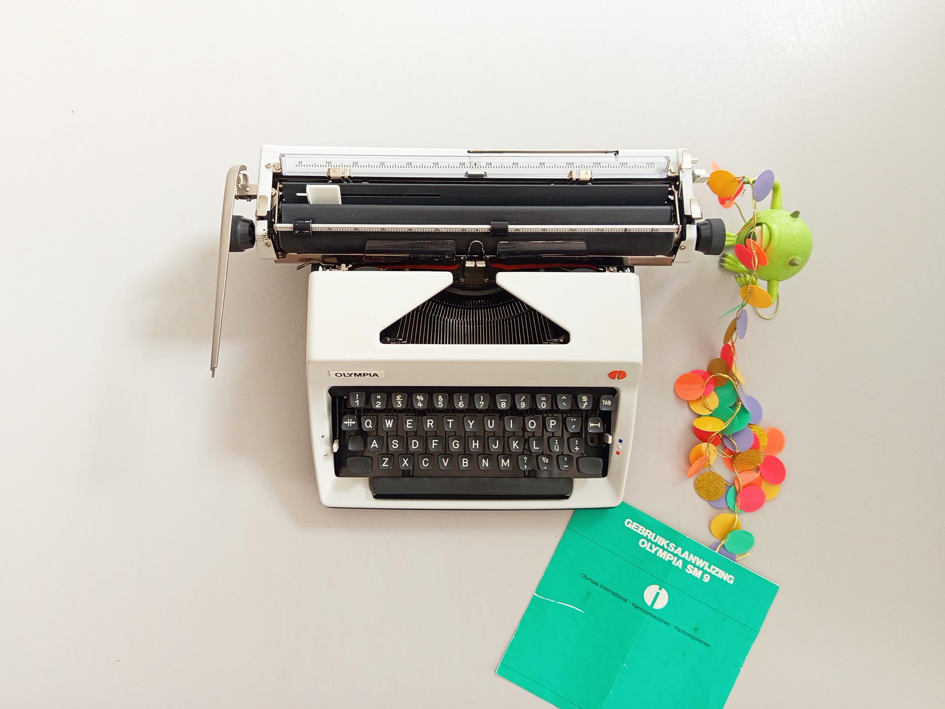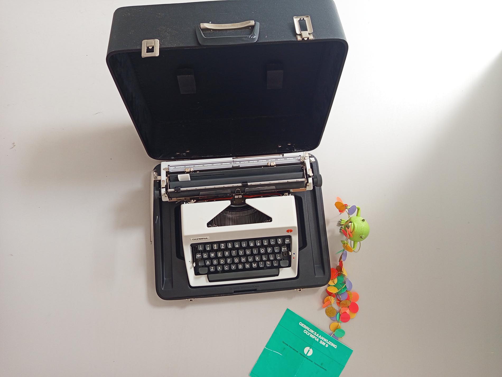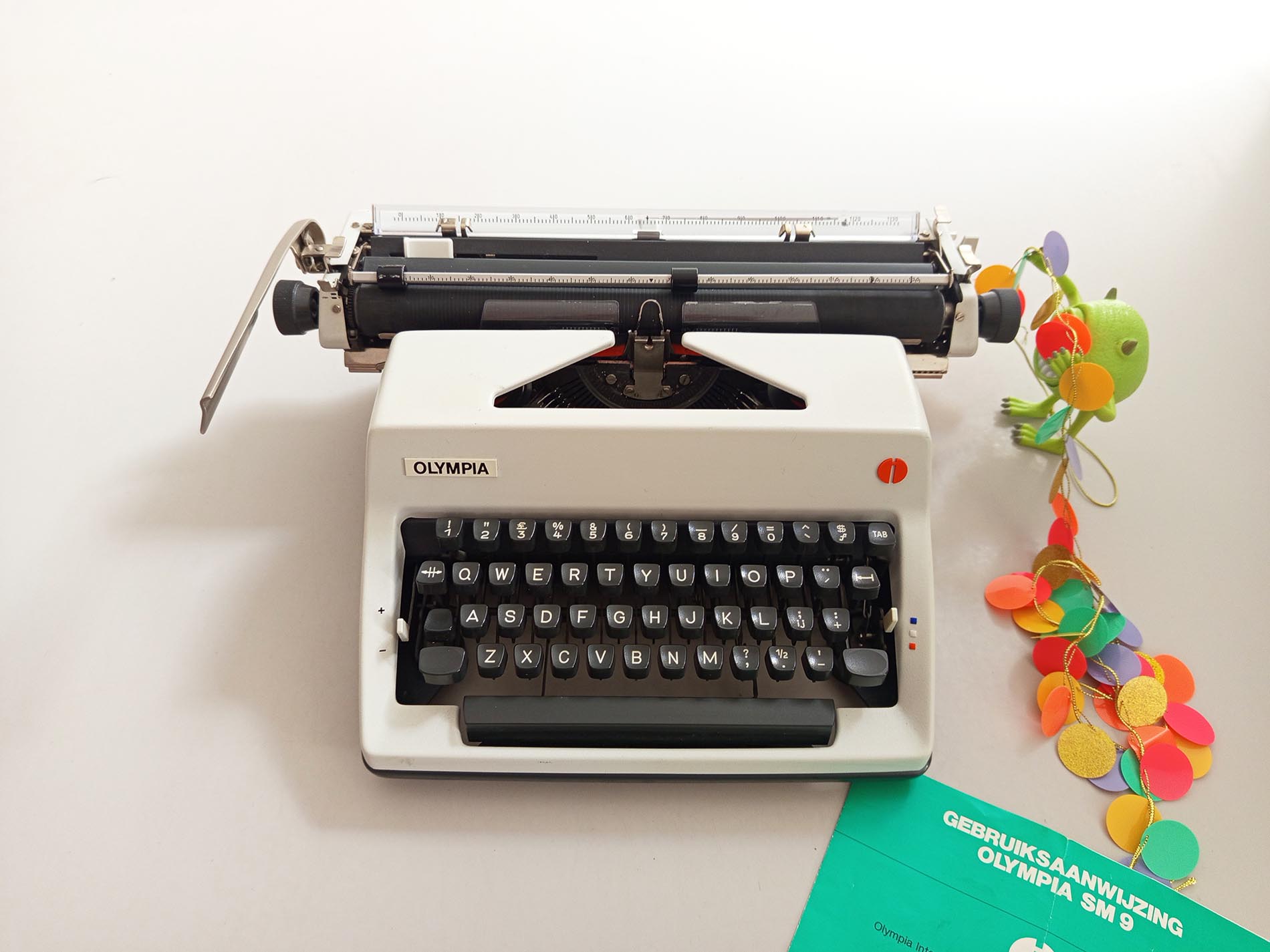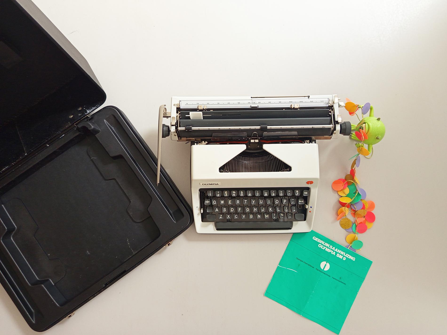 Mooie Off white vintage Olympia SM9 typemachine een wat ouder model uit de jaren 60. Het is een robuuste zware metalen off white body met donkergrijze details. De typemachine is getest en geeft nog een goede afdruk (let op dit is geen nieuw lint ) en is dus gebruiksklaar. De typemachine is op te bergen in een grote stevige koffer. Het is een robuust model met een bredere wagen deze komt minder vaak voor. Dat betekent dus ook geschikt voor A3 papier of liggend A4 . Wat ook uniek is dat het gaat om een Pica lettertype klein en verfijnd. Het is dan wel een robuust model maar typt zeer fijn en soepel.