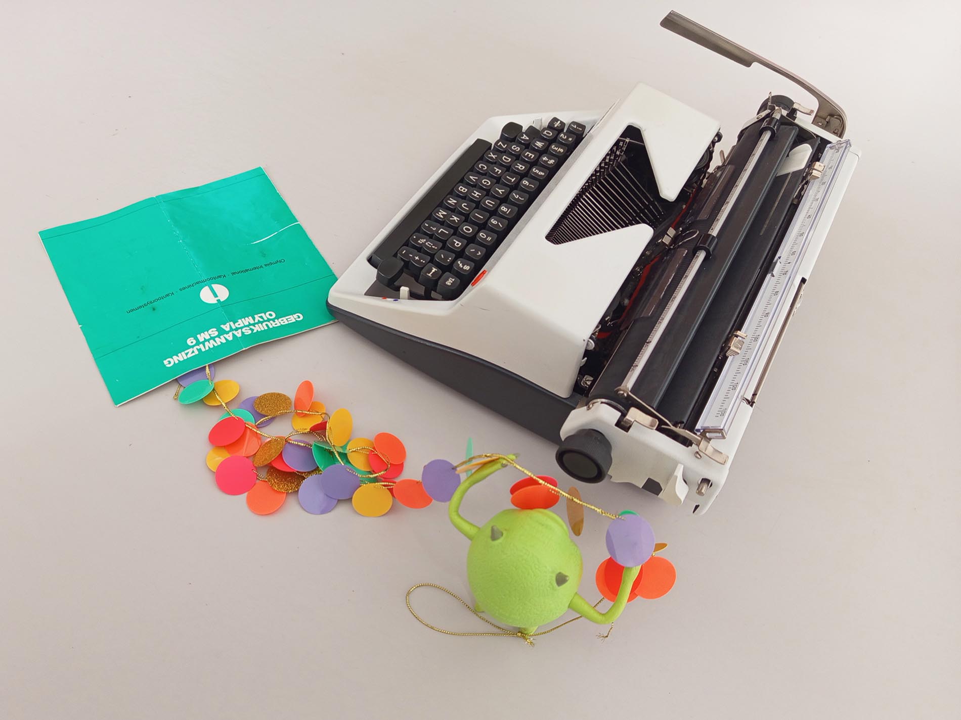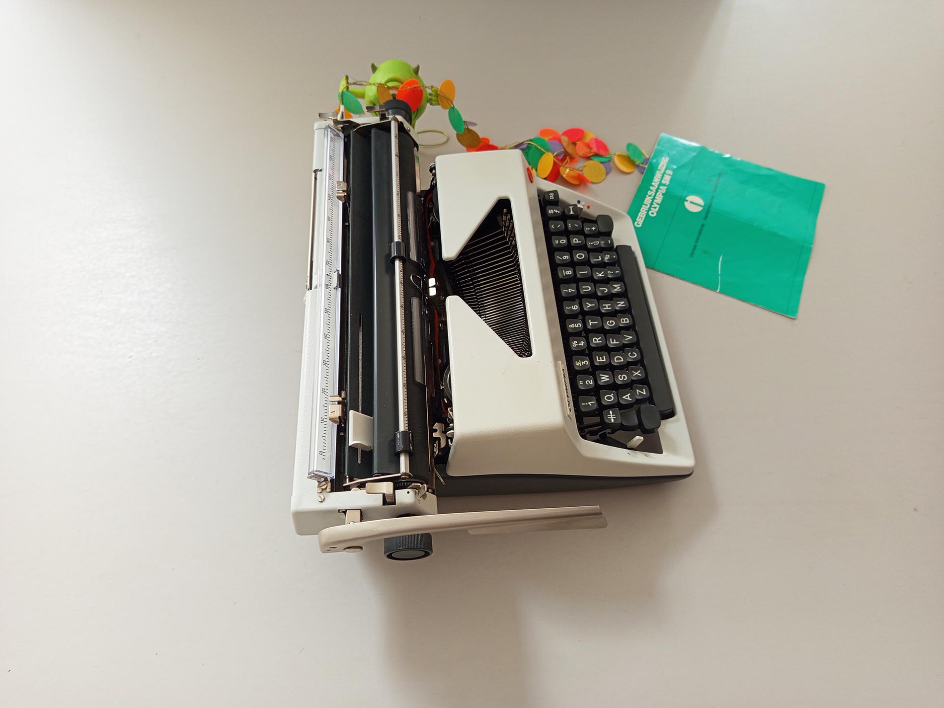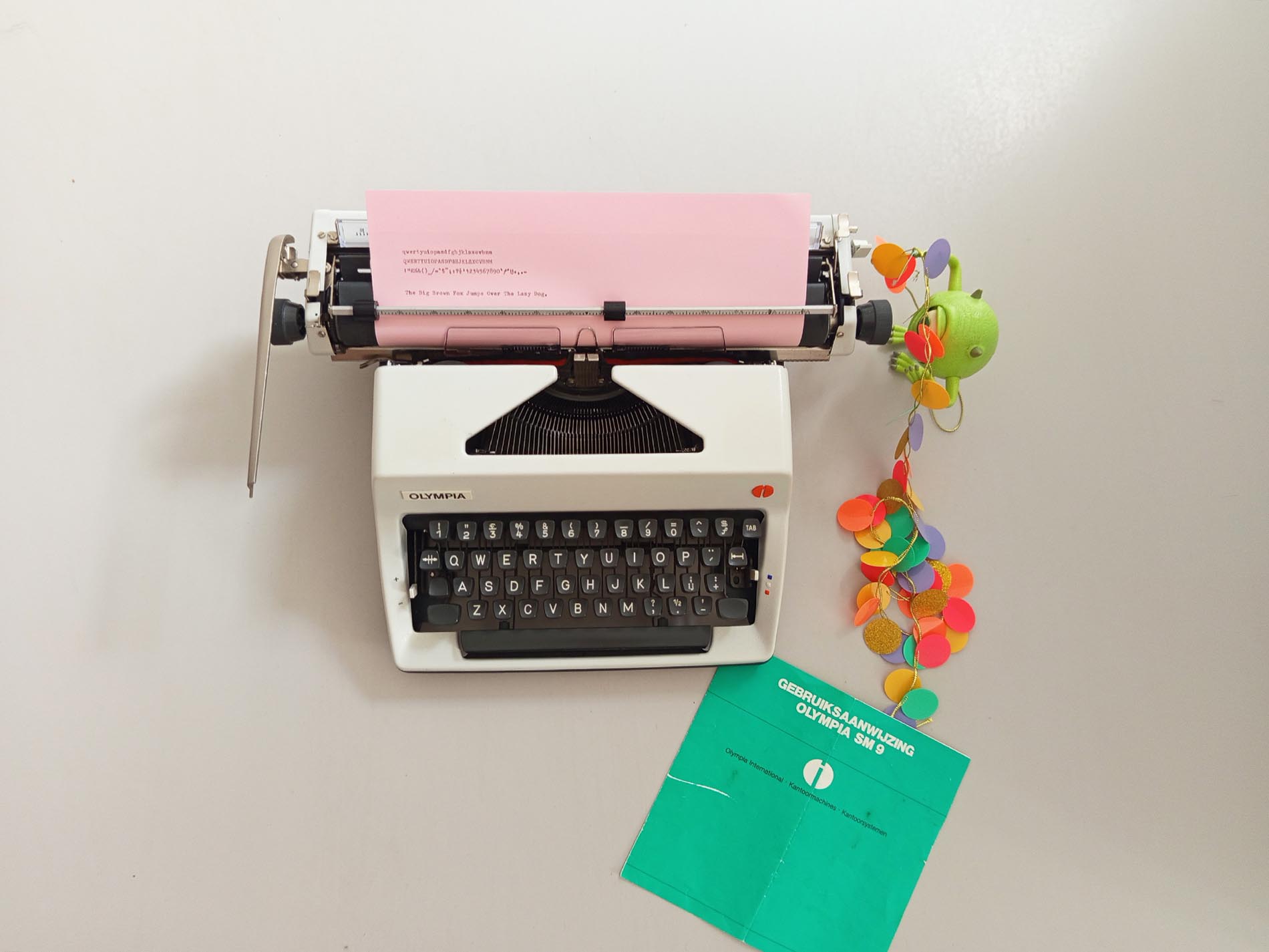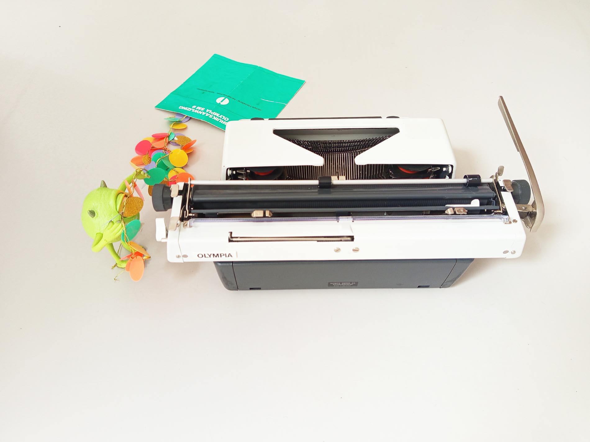 Mooie Off white vintage Olympia SM9 typemachine een wat ouder model uit de jaren 60. Het is een robuuste zware metalen off white body met donkergrijze details. De typemachine is getest en geeft nog een goede afdruk (let op dit is geen nieuw lint ) en is dus gebruiksklaar. De typemachine is op te bergen in een grote stevige koffer. Het is een robuust model met een bredere wagen deze komt minder vaak voor. Dat betekent dus ook geschikt voor A3 papier of liggend A4 . Wat ook uniek is dat het gaat om een Pica lettertype klein en verfijnd. Het is dan wel een robuust model maar typt zeer fijn en soepel.