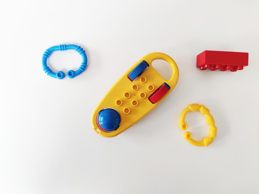 Vintage duplo rammelaar skateboard die ook te bouwen is met duplo blokken. Oorspronkelijk hoort de eekhoorn rammelaar erop dan raken de balletjes elkaar.