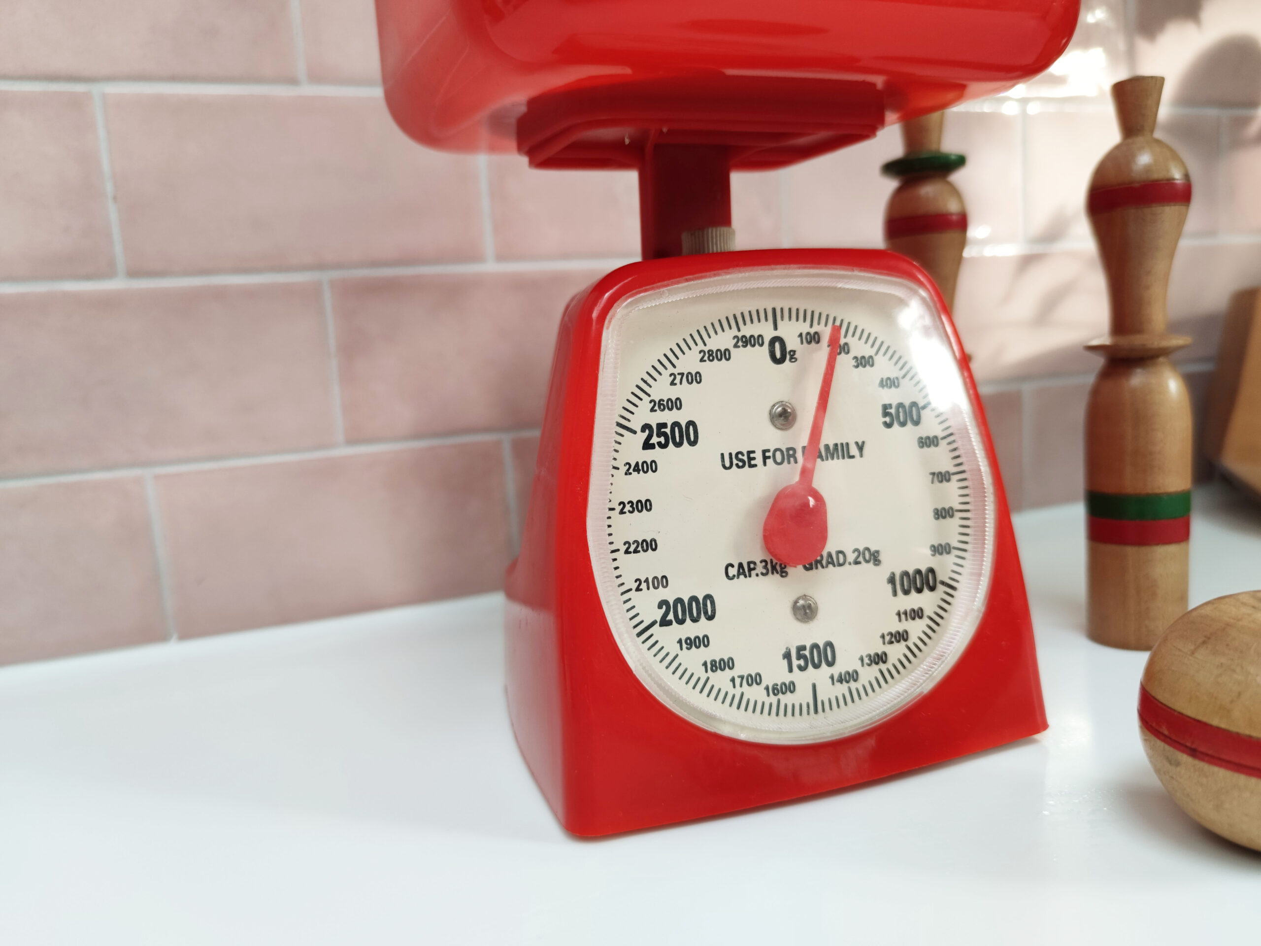 Retro rode keukenweegschaal. Het is een oud model met een prachtige opzet bakje met handige schenktuit.