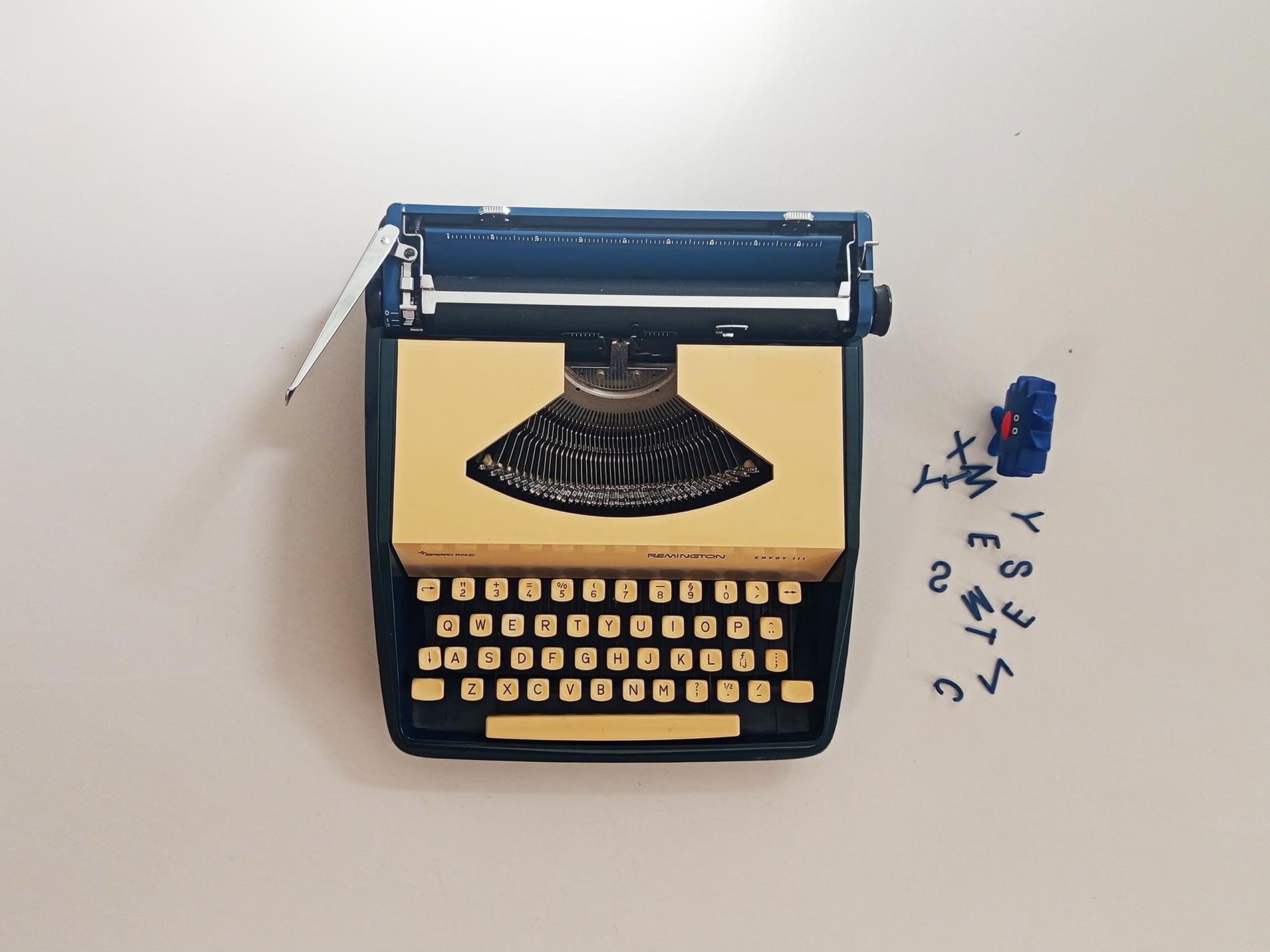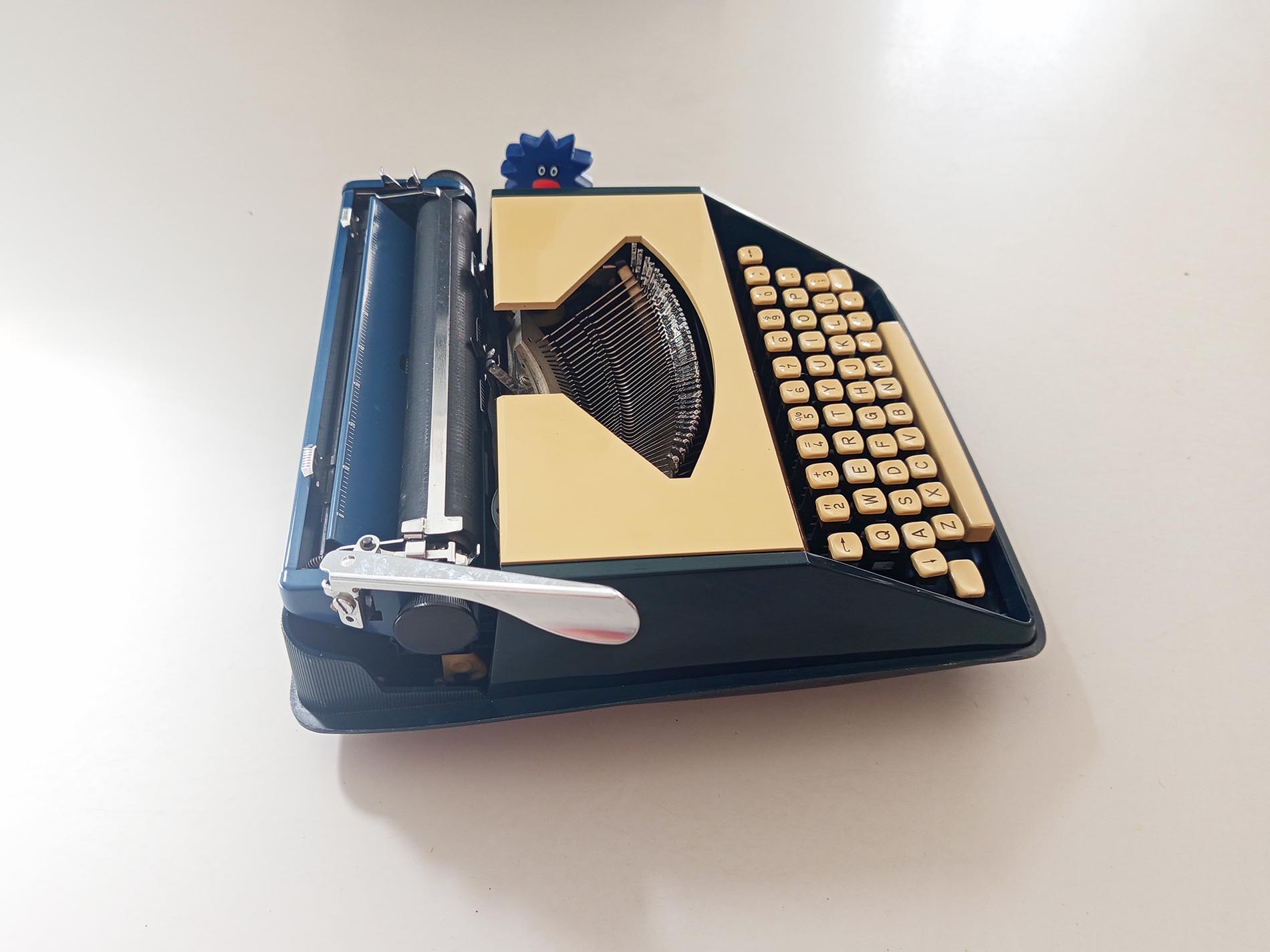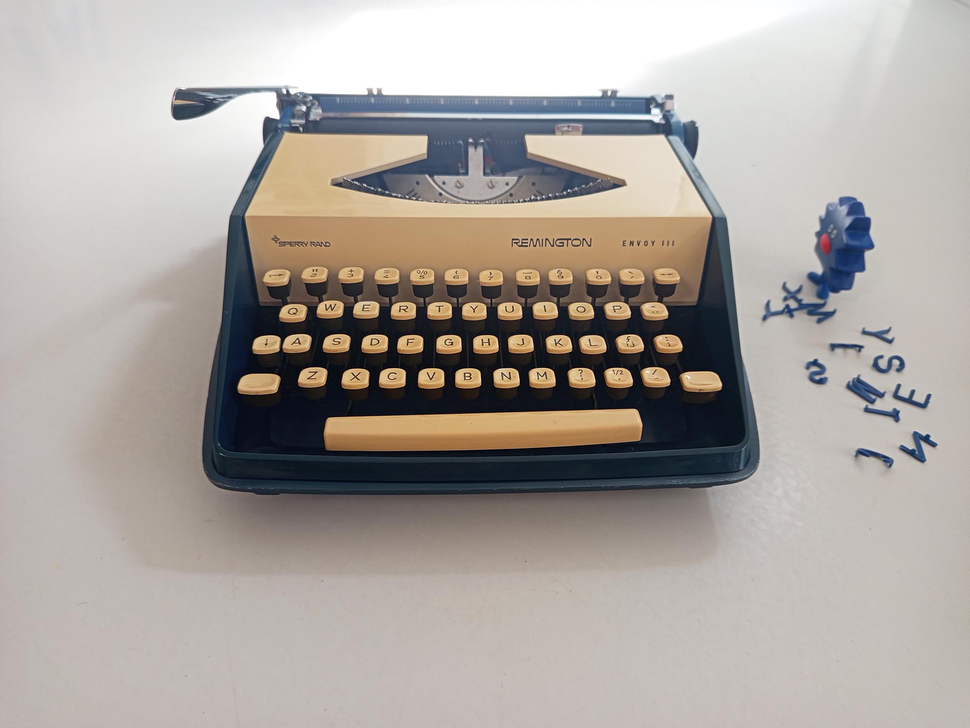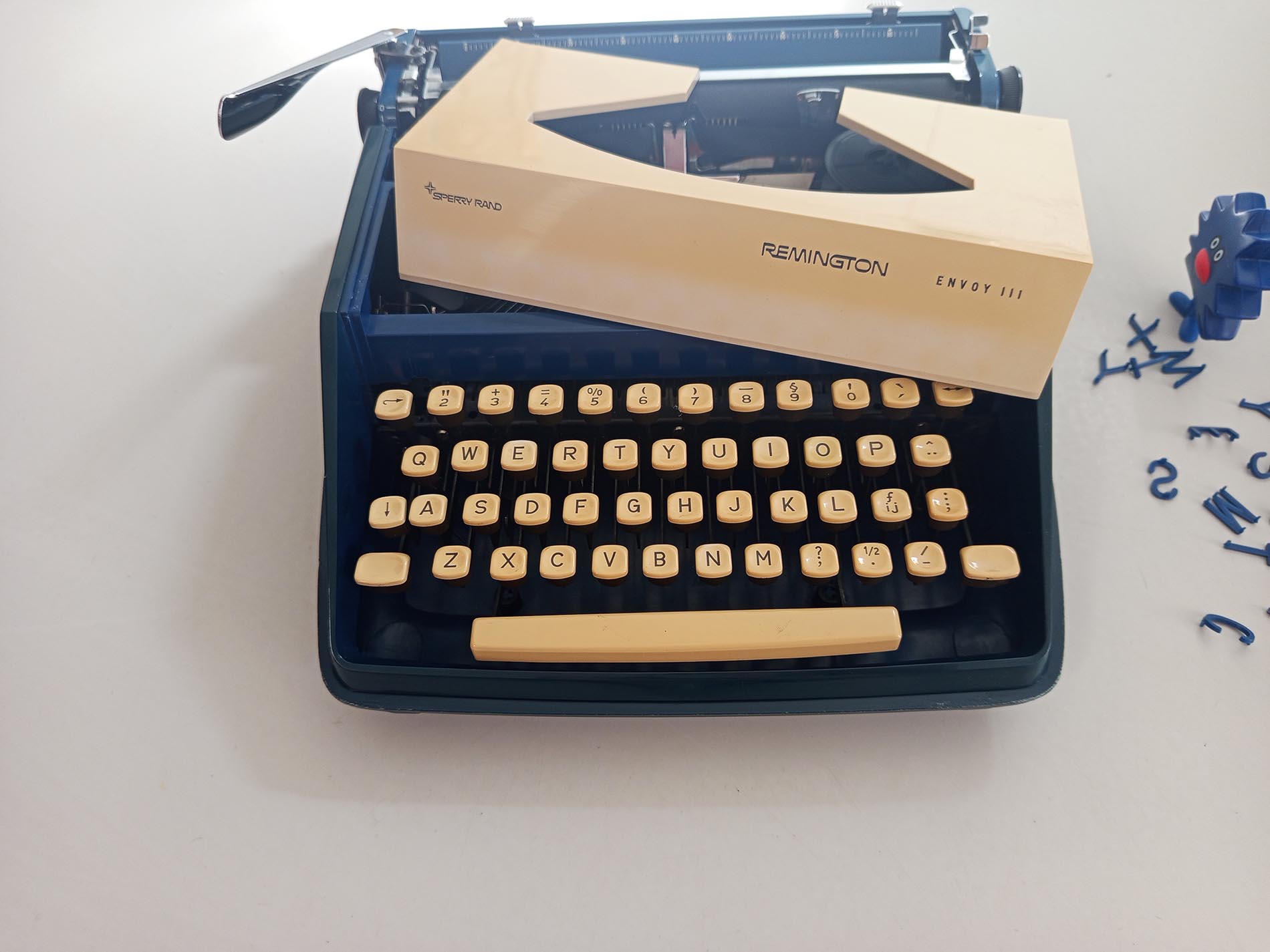 Vintage donker blauwe / crème Sperry Rand Remington Envoy III typemachine. Mooie typemachine in een kleur die je niet vaak tegen komt. Helaas kom deze wel uit een rokershuis en is het blauw wat vergeeld en oogt wat groen en het crème helemaal vergeeld. De typemachine heeft plastic body en plastic deksel. Is uitgebreid getest en werkt naar behoren en heeft zelfs een nieuw lint.