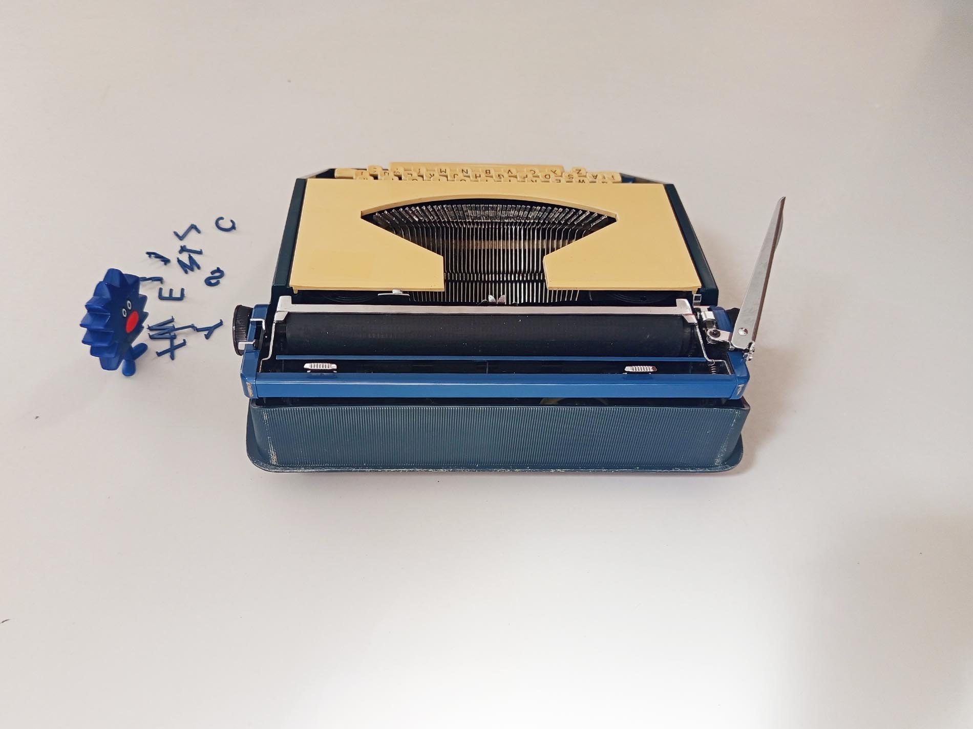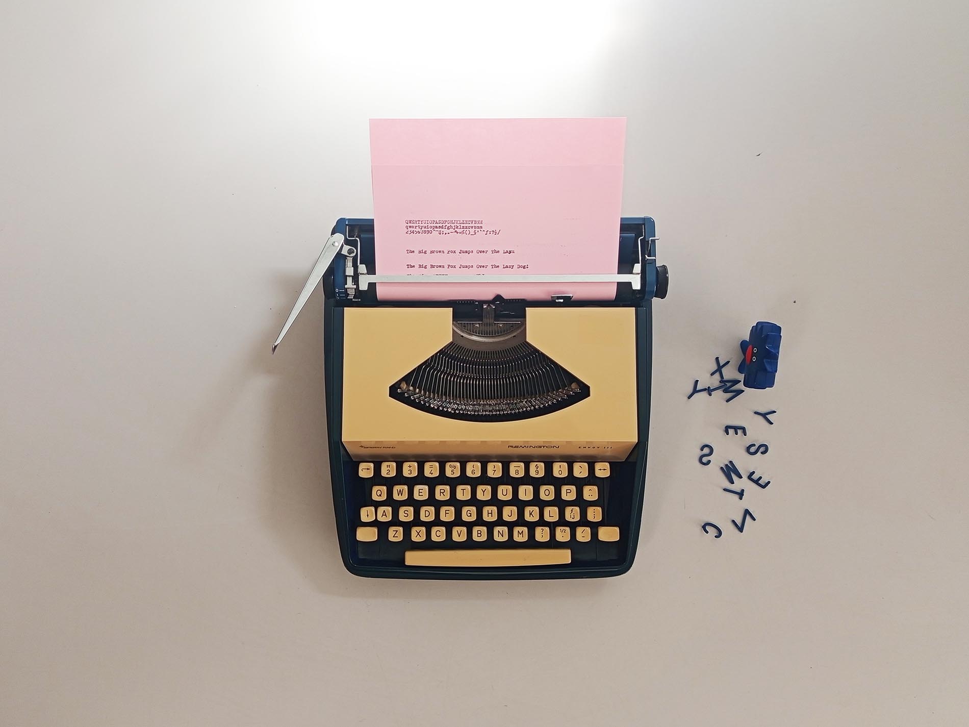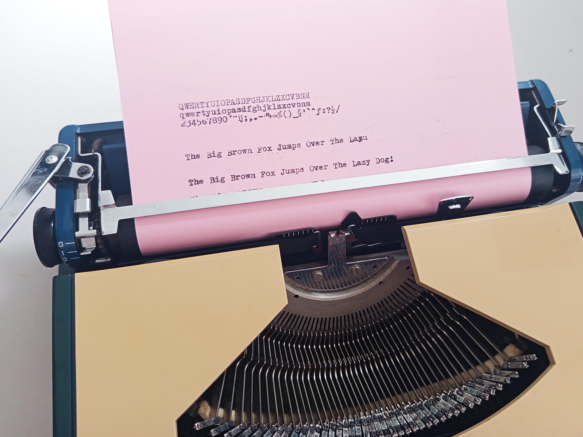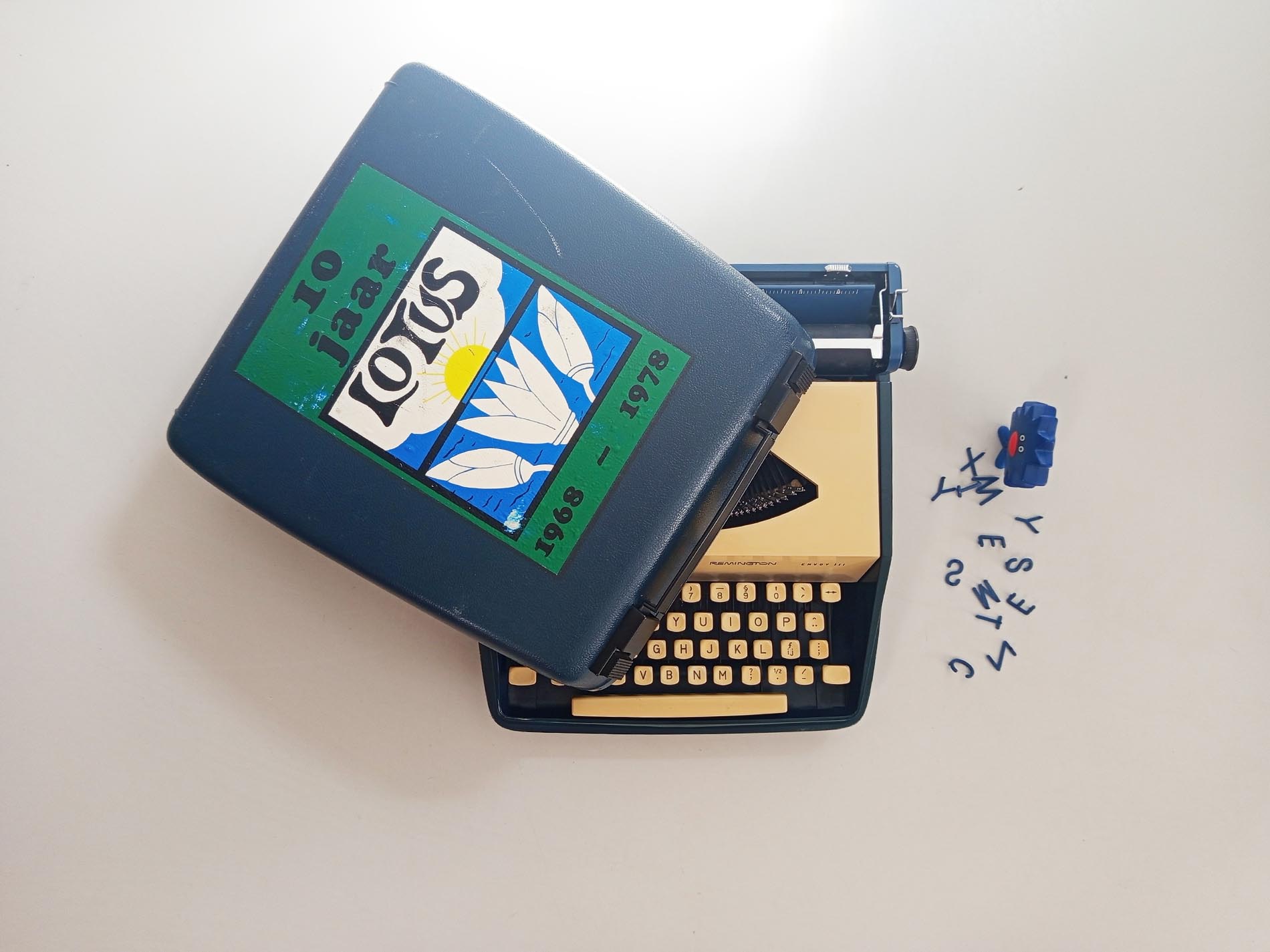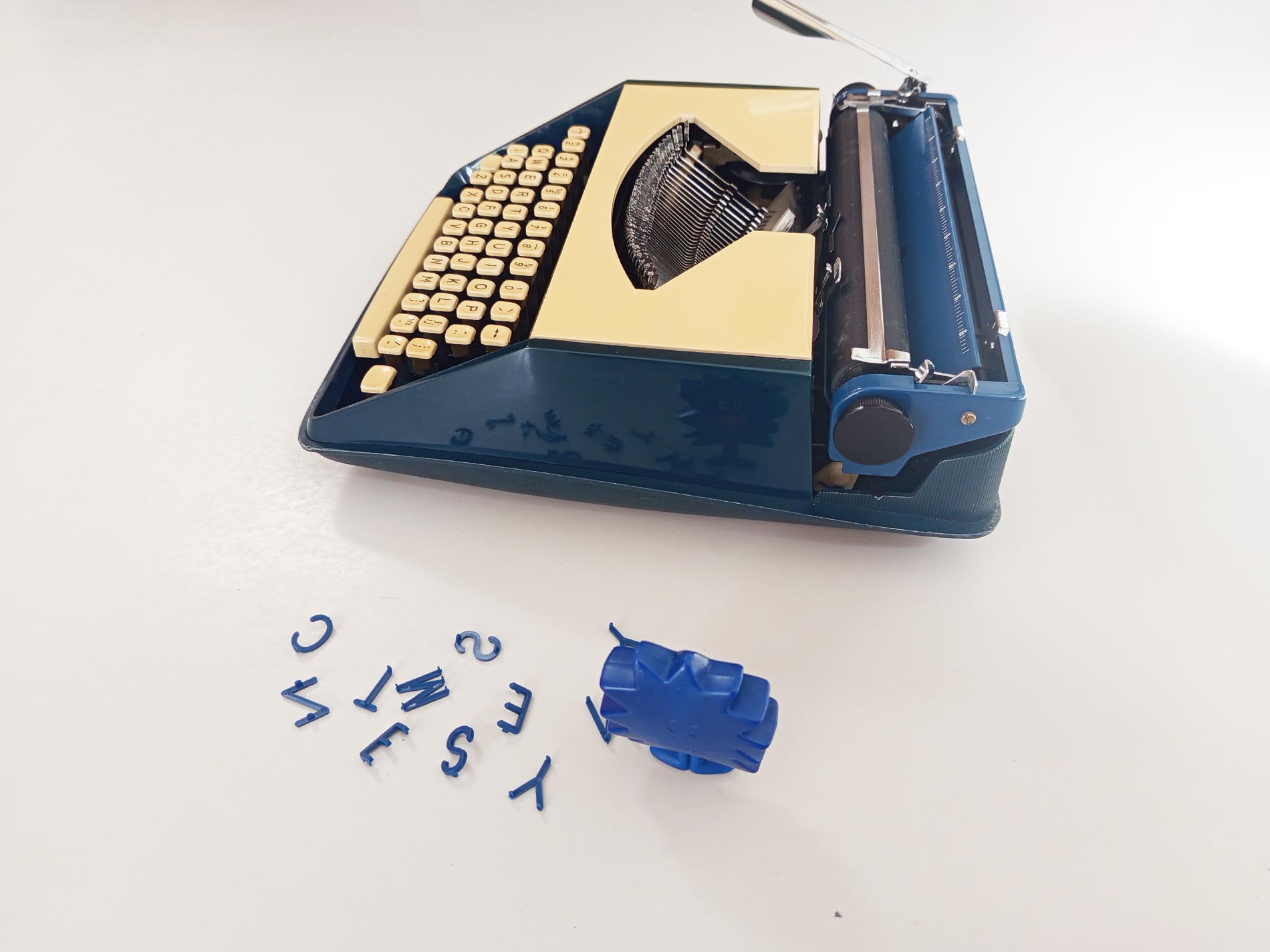 Vintage donker blauwe / crème Sperry Rand Remington Envoy III typemachine. Mooie typemachine in een kleur die je niet vaak tegen komt. Helaas kom deze wel uit een rokershuis en is het blauw wat vergeeld en oogt wat groen en het crème helemaal vergeeld. De typemachine heeft plastic body en plastic deksel. Is uitgebreid getest en werkt naar behoren en heeft zelfs een nieuw lint.