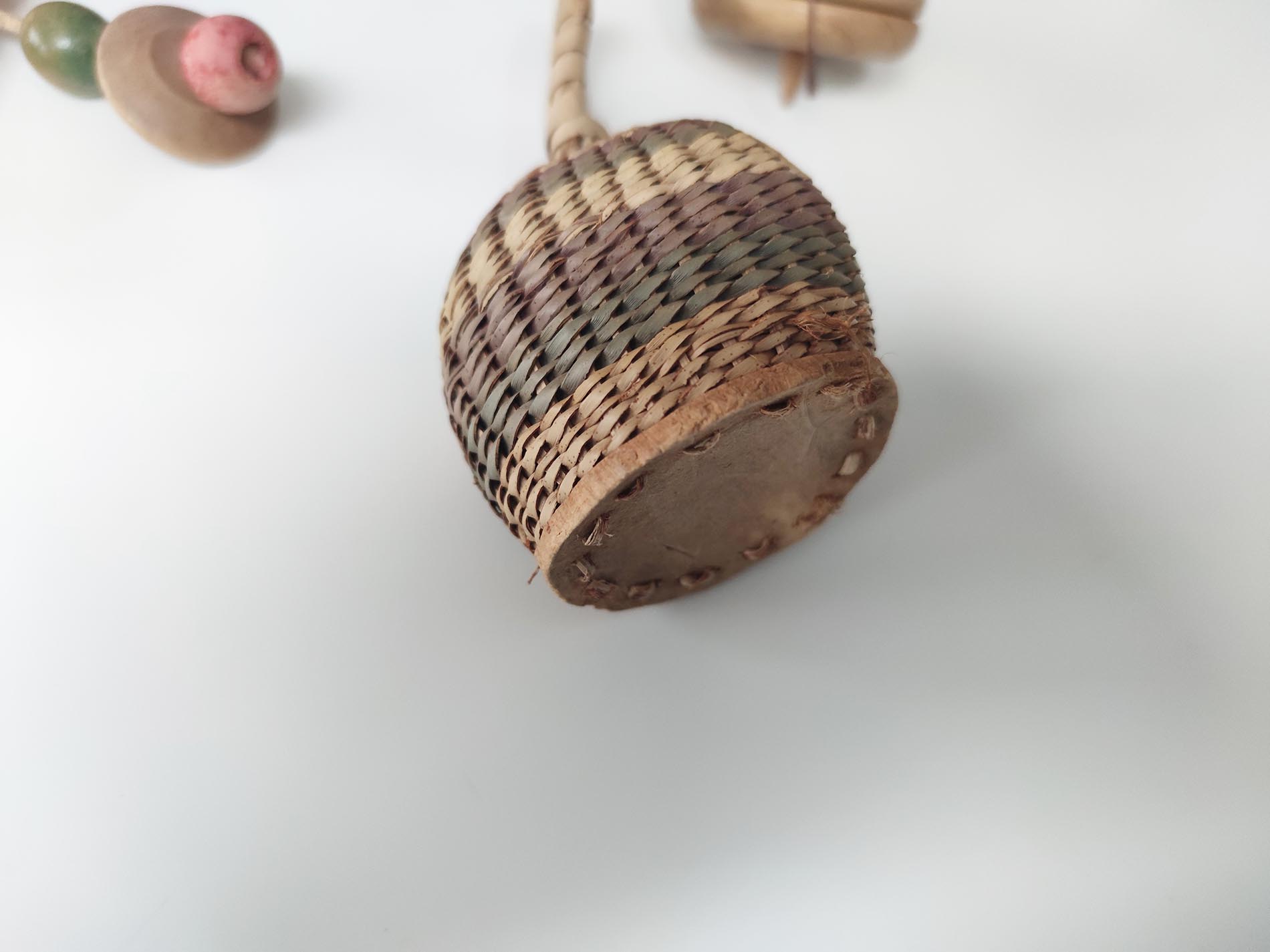 Leuke vintage rotan gevlochten houten rammelaar. Het is een leuk gevlochten model met grote lus om te rammelen.