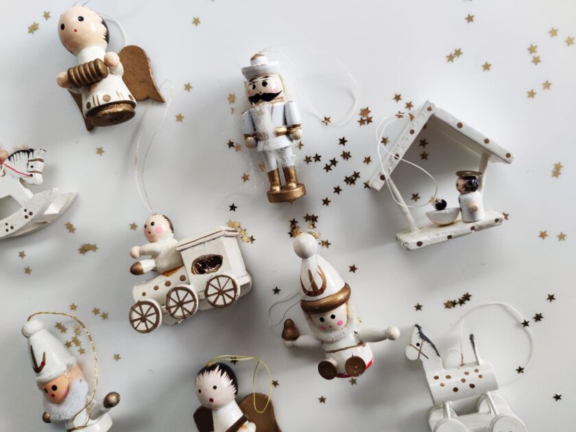 Set van 9 vintage houten ornamenten. Wit / goud de notenkraker heeft een hoogte van 6 cm.