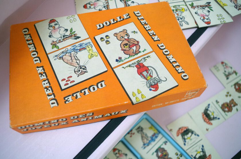 Mooie set vintage domino spel. Een vrolijke dolle dieren domino. Uitgave van NV SMEETS + SCHIPPERS. Grote domino kaartjes met mooie vintage illustraties.